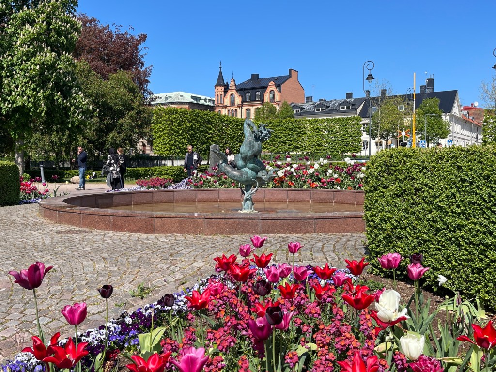 18 mei. Opstaan met een stralend blauwe lucht en de eerste koffie drinken aan het meertje. Hoe mooi kan je het hebben. Lekker gewandeld en de dappere Lia heeft gezwommen. Het doel vandaag is Kristianstad. We parkeerden eerst op een verlaten camping en vonden het toch een beetje raar om daar te blijven staan. Verder gereden naar een afgebakende ruimte op een grote parkeerplaats. Sitecode 29159. Prima gratis plek bij het NATURUM: mooi natuurgebied (moeras) met wandel en fietspaden. Aansluitend loop je naar Tivoli. Een stadspark. Om vijf uur weer bij de camper, een grote verrassing: komt Annie, mijn wandelmaatje uit Dalen, aan lopen. Ik wist dat ze met Henk en zus Henk in Zweden waren maar dat we elkaar tegenkwamen was echt heel leuk. Annie zag campers staan en dacht “ik ga eens even kijken!” De stad kon me niet zo bekoren maar Tivoli en het natuurgebied des te meer.
