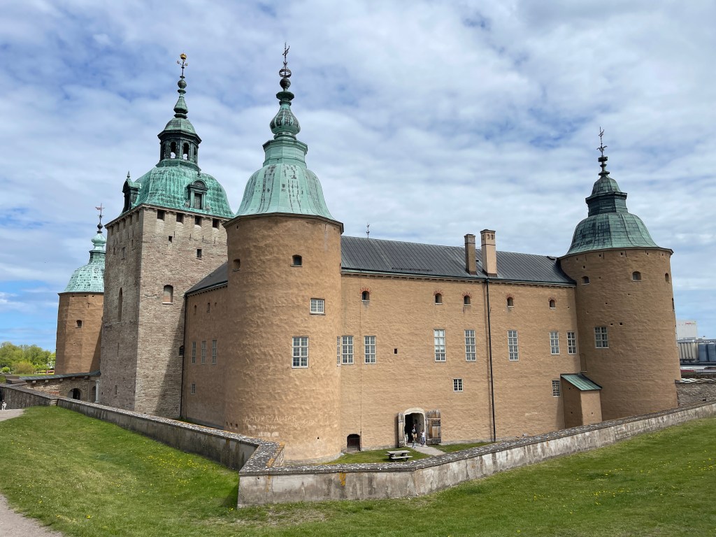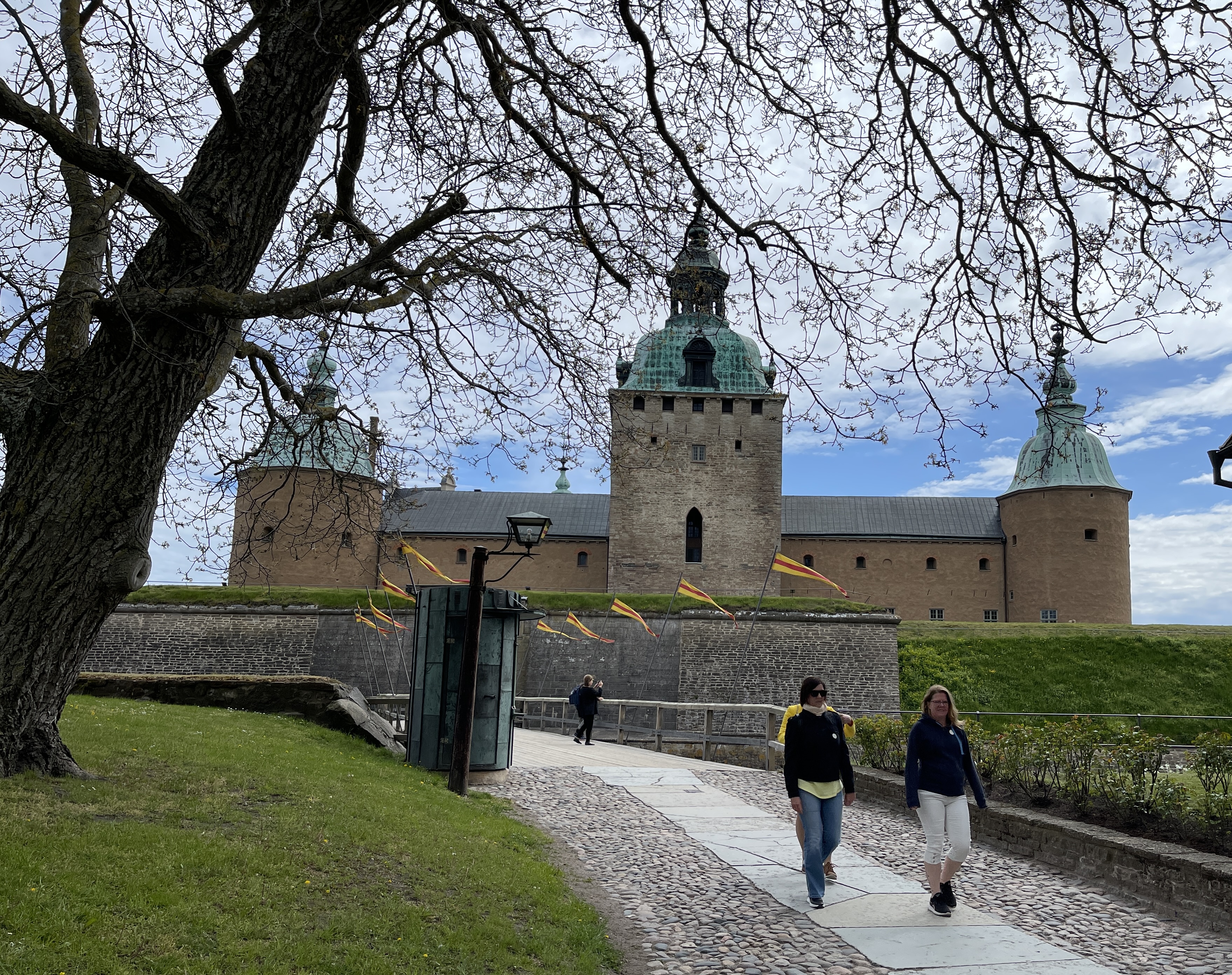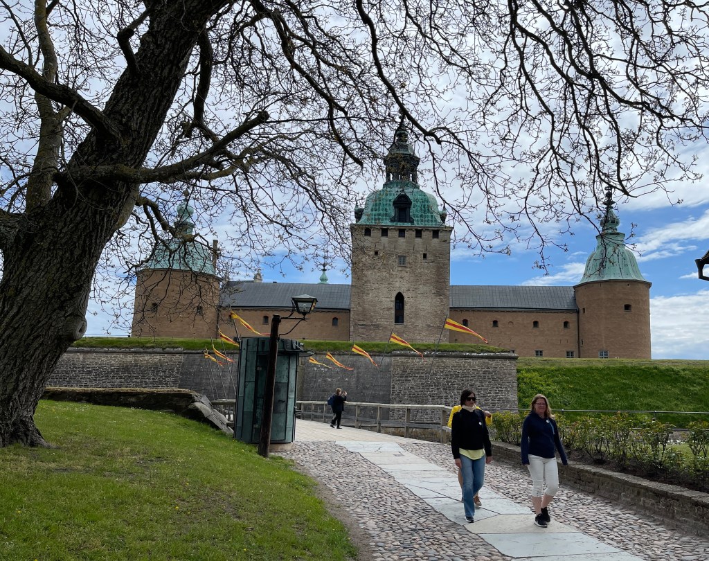 19 en 20 mei. Kalmar. Camping 23652. We zijn eerst wezen kijken in de haven waar 13 plaatsen zijn. Alles vol. Gelukkig maar want ik had er niet willen blijven. Wat een onrustige plek. Doorgereden naar deze camping en ja die zijn in Zweden niet goedkoop en dat wisten we. We worden wel beloond, staan hier heerlijk. Vanuit de camping worden drie wandelingen aangegeven van 3, 3,5 en 6 km. Vanmiddag meteen maar een gelopen. Mooie natuur. Besloten hier maar twee nachten te blijven. Op de fiets naar het kasteel in Kalmar. De foto van mij en Jolanda is gemaakt op de Monet tentoonstelling in het kasteel. En op de gedekte tafel: opgezette vogeltjes!! Na het kasteel de stad nog verkend. Groot plein, grote gebouwen. Ik vond de watertoren nog het mooist. En door het poortje achter de watertoren de kleine straatjes.