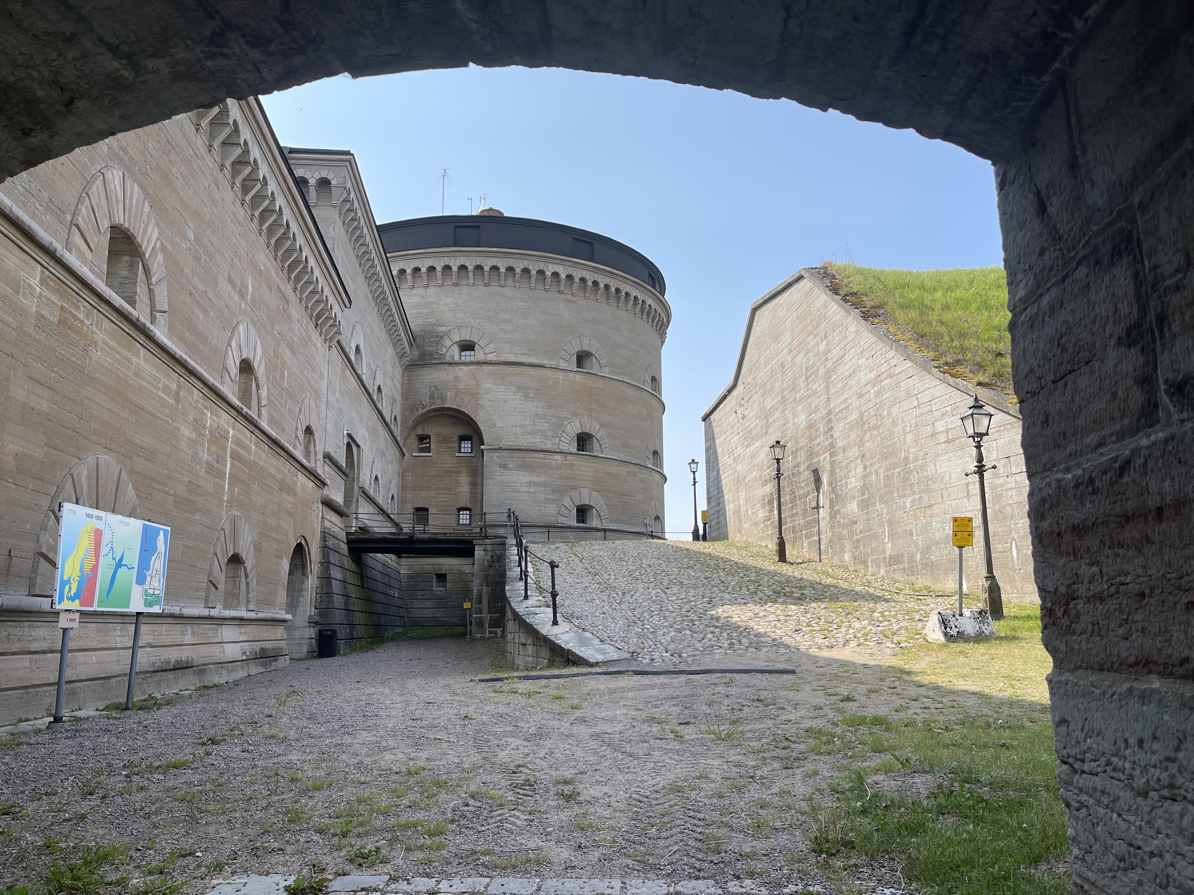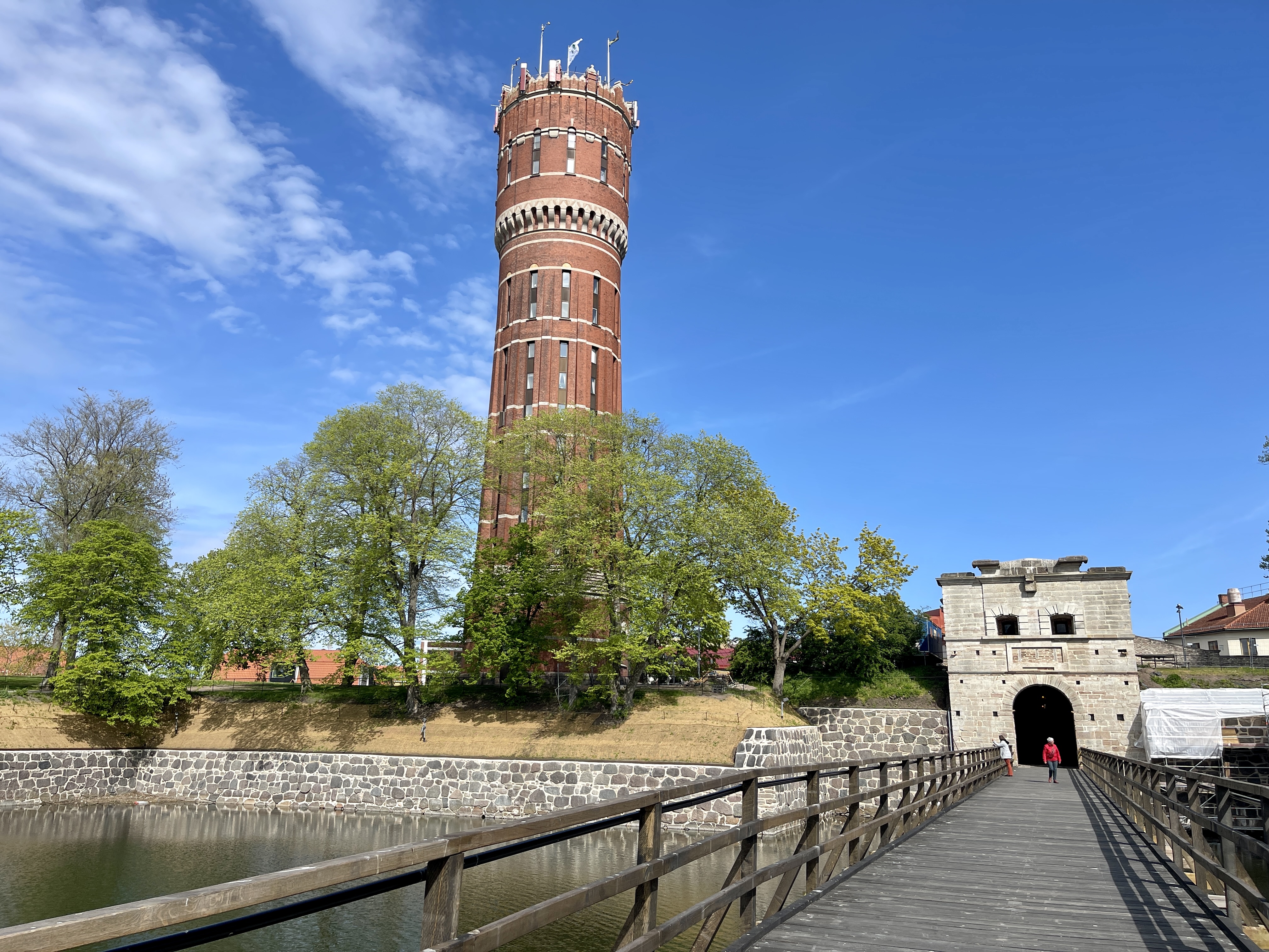 1 juni: Vanmorgen vroeg naar de Karlsborg vesting gelopen. Enorm terrein, grote gebouwen. Het kanon staat richting Gota gericht. Bouw begonnen in 1819 en klaar in 1909. In 1925 al verouderd voor gebruik tegen de moderne wapens. Enorm terrein, wonen nog veel mensen en wordt nu voor opleidingen gebruikt. Op de terugweg zag Lia een fietsenmaker en daar zijn we wezen vragen of haar wiel, waar een slag inzat, gemaakt kon worden. Dat kon. Morgen ophalen en zo blijven we een dagje op deze camperplaats. Gewoon fijn dat Lia dan haar fiets weer kan gebruiken. Morgen gaan we een wat ongebruikelijke move maken. Stukje terug richting Tidaholm om daar wat kerkjes te bekijken.