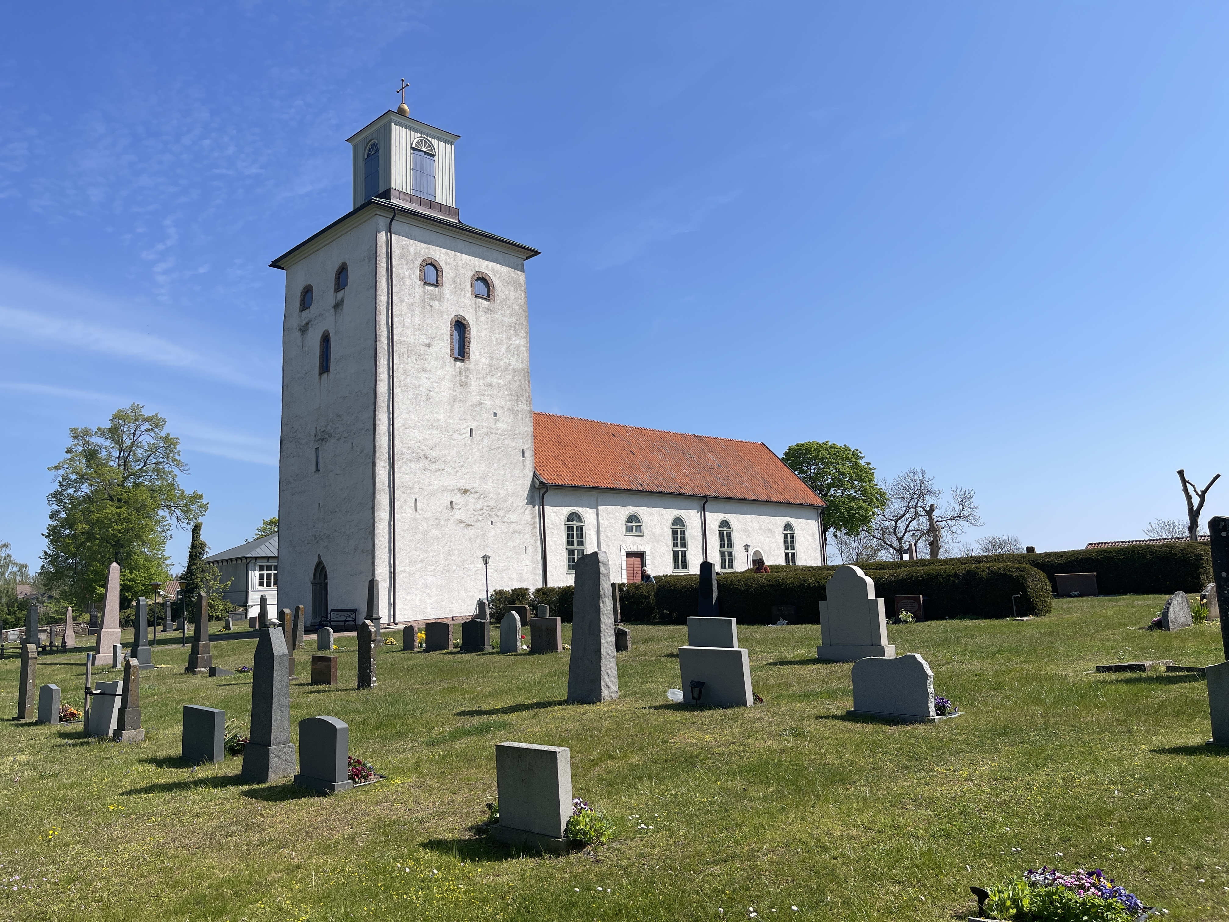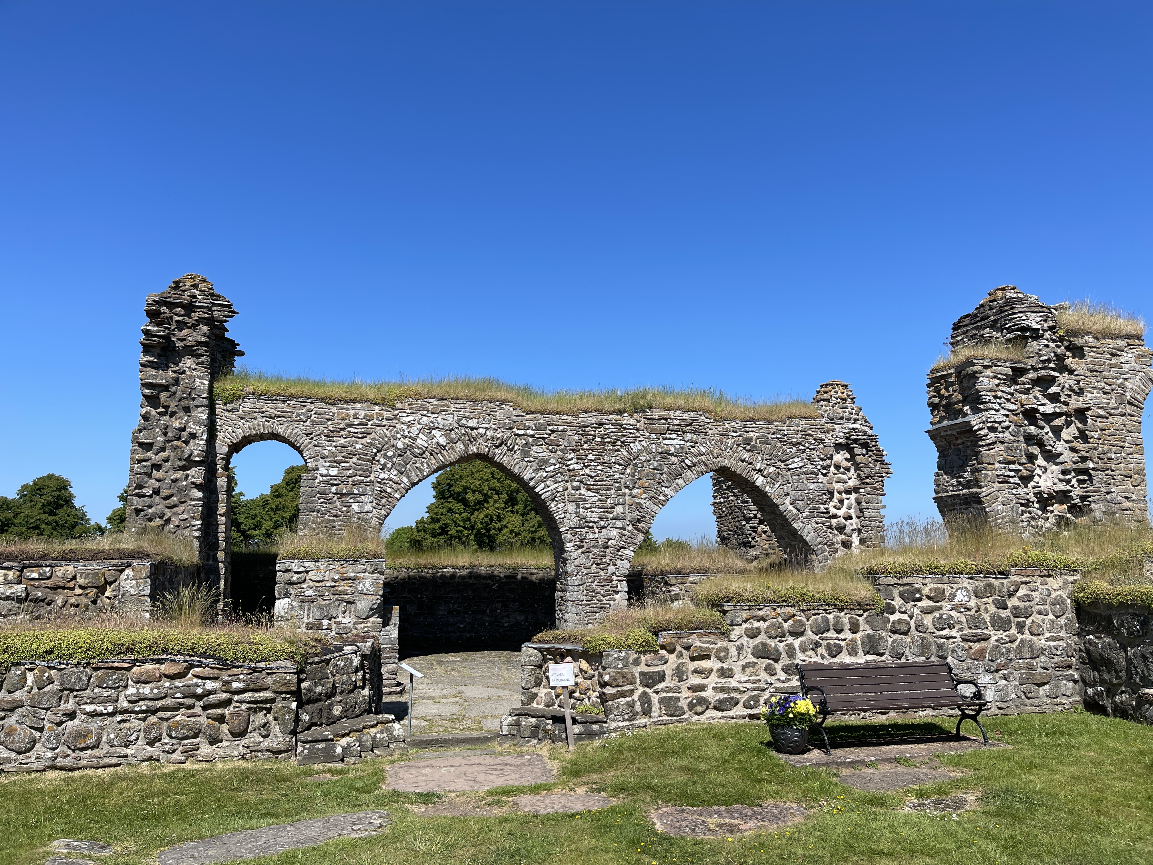 8 juni Eerst naar de tandarts, foto gemaakt en alles goed. We rijden naar Gudhem Abbey, een ruïne van een voormalig nonnenklooster in gebruik van 1152 tot 1529. Mensen komen er ook heen vanwege de kloostertuinen. De ruïne ligt bij een in gebruik zijnde kerk.
