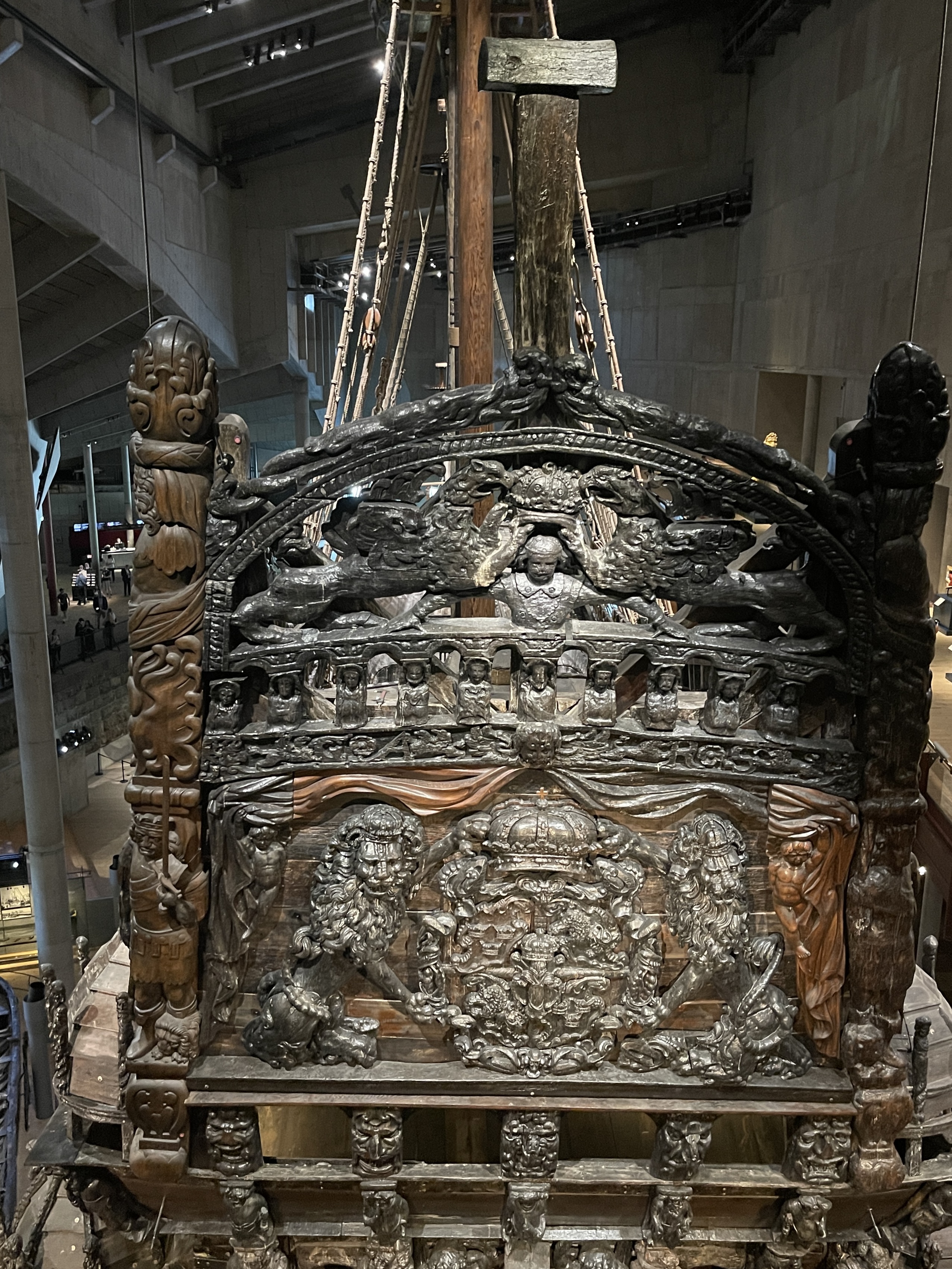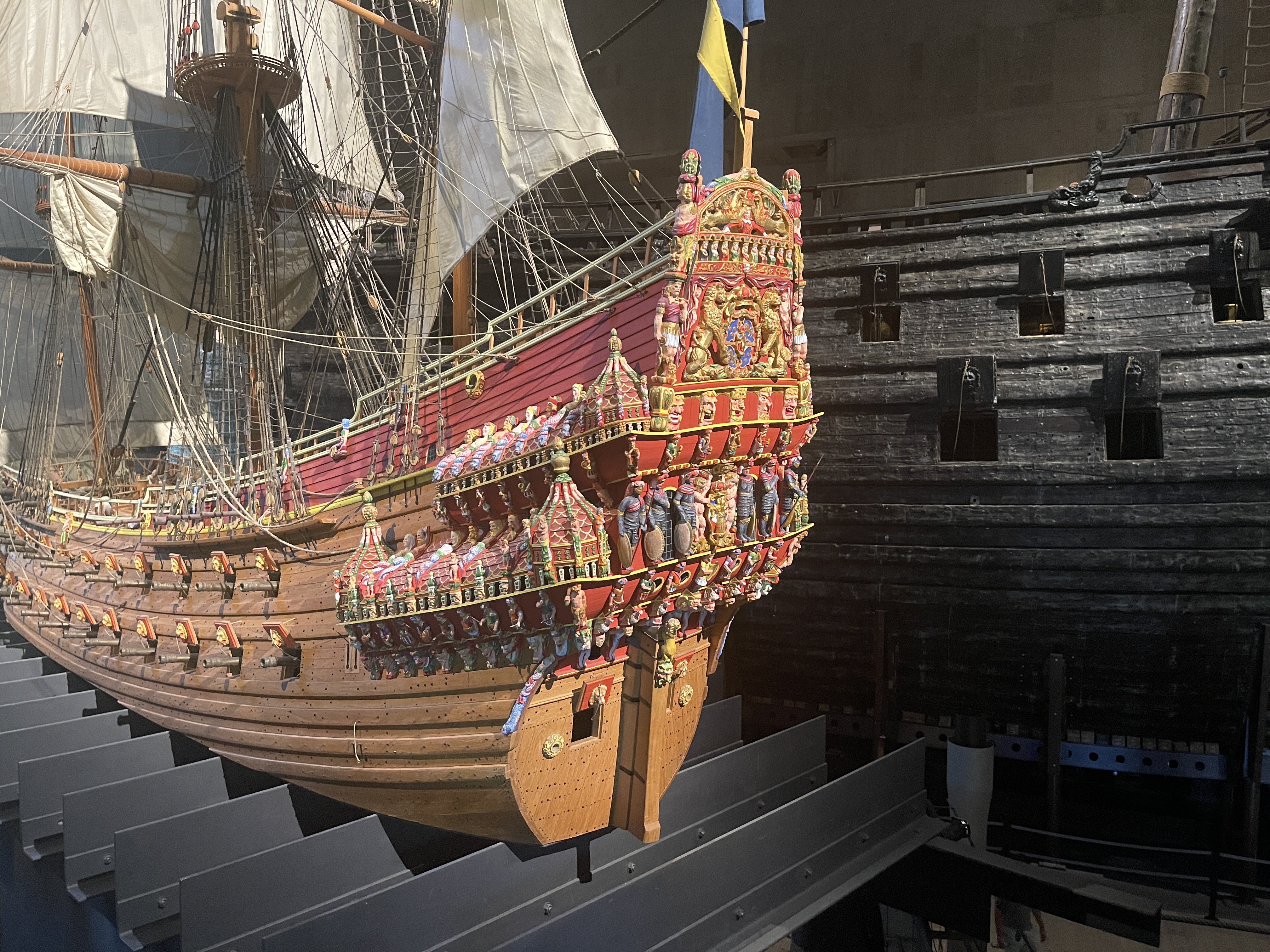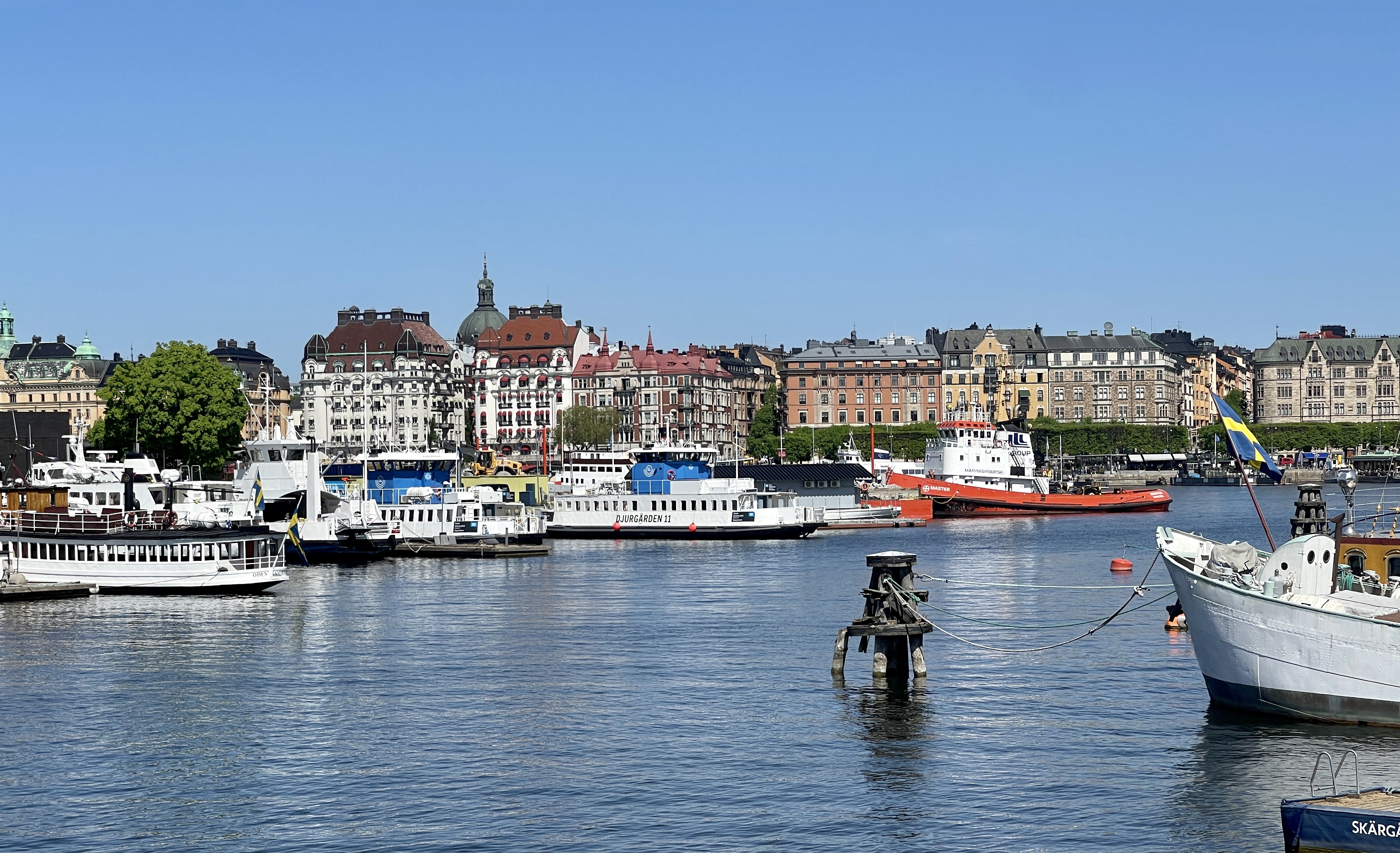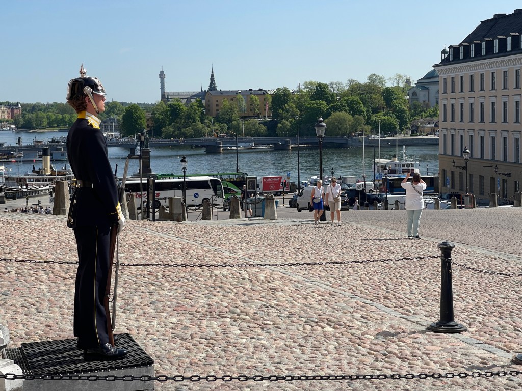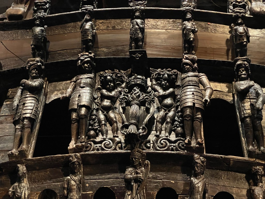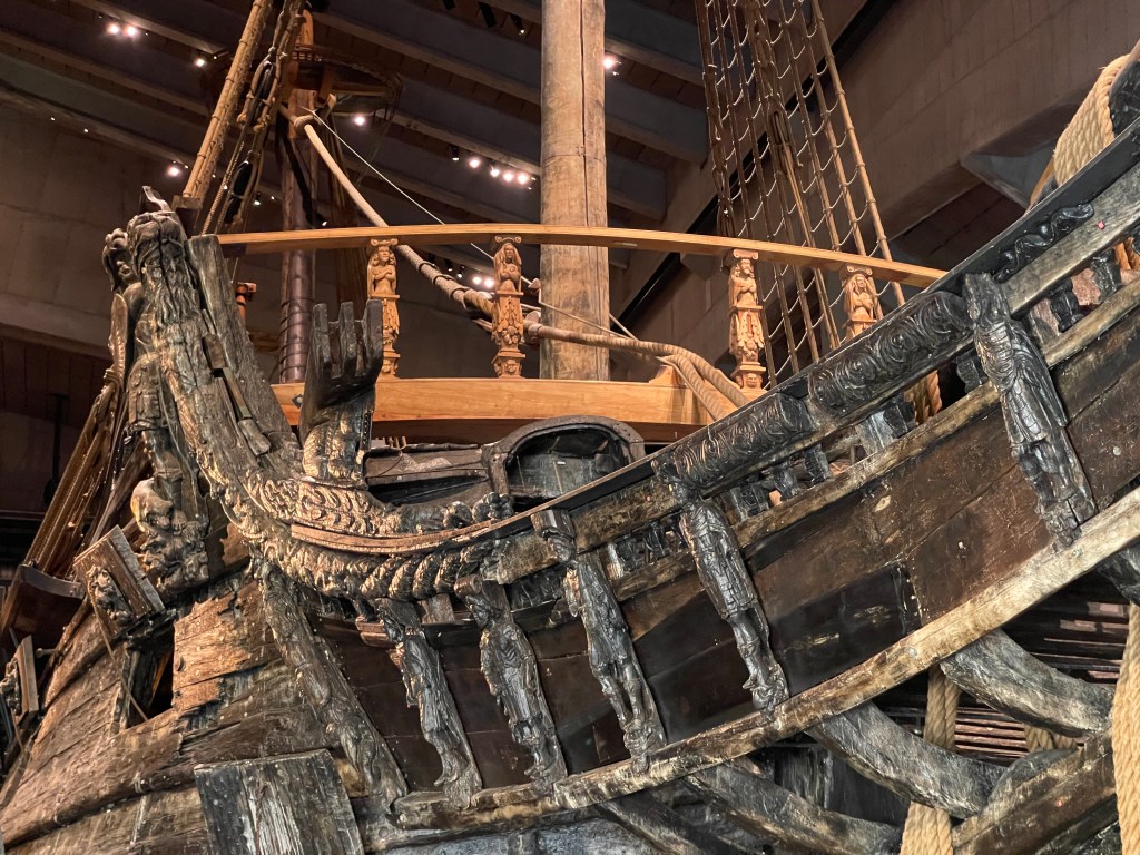 Een bezoek aan het Vasa museum was ook zeer de moeite waard. Het in de 17 de eeuw gebouwde Vasa schip dat bij de te waterlating meteen zonk is na 300 jaar weer bovengehaald en gerestaureerd. Het schip had oorspronkelijk prachtige kleuren zie het schaalmodel. Het zal de tijd niet overleven maar voor nu toch wel interessant. Buiten richting het pontje zag ik een Italiaanse ijswagen. Zonder meer het lekkerste ijs dat we gehad hebben en wij zagen de Zweden veel ijs eten, overal. Ik heb weinig foto’s gemaakt. We praten inmiddels over 24 graden en midden op de dag. We hebben veel kilometers gelopen. Achteraf bleek dat we ook met de openbaar vervoer boot naar het museum hadden kunnen gaan.Voor het Vasa museum kan je beter even kijken op hun website. Zij werken bij drukte met een tijdslot. Een dag in het oude gedeelte van Stockholm was voor ons genoeg. Weinig behoefte om naar het moderne centrum te gaan.