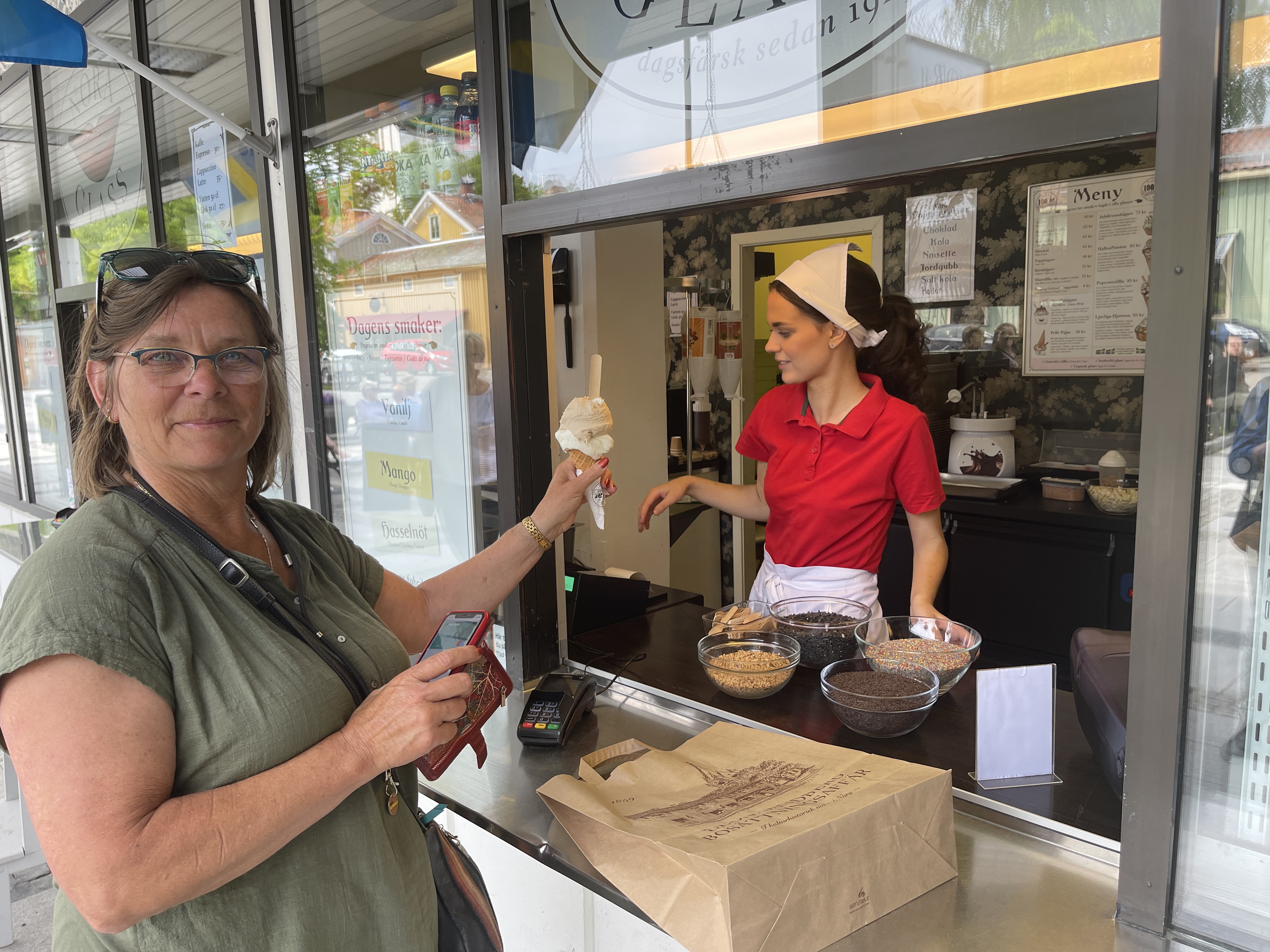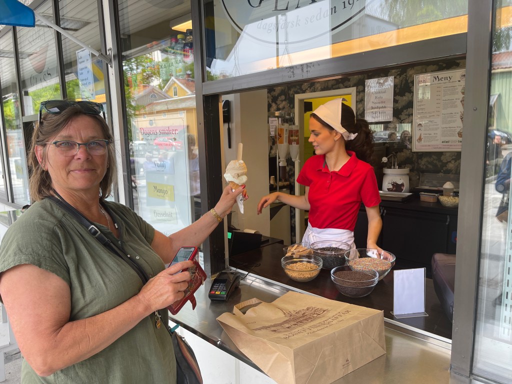 4 juni: Vandaag een langere rit richting Åsarpsdistrict. Tot Gränna konden we nog de snelweg vermijden. De weg ligt hier hoog en zo hadden we mooie vergezichten over het meer. Kort gekeken bij de haven waar de Ferry naar het eiland Visingsö vertrekt. Was de moeite niet waard. Vandaar snelweg langs het drukke Jönköping en verder naar Ulricheham. Daar viel het even tegen want alle camperplaatsen waren vol. Op Google maps vonden we een camping vlakbij. Het is overduidelijk dat we nu in de drukte zitten. Vanaf een erg mooie parkeerplaats bij Gränna konden we lopen naar de Cappa Polkagris fabriek. Van de twee kleuren zuurstokken. Alles wordt met de hand gemaakt. Wel leuk om te zien hoe het spul heen en weer in de lucht wordt gegooid zodat de plak steeds langer en dunner wordt.