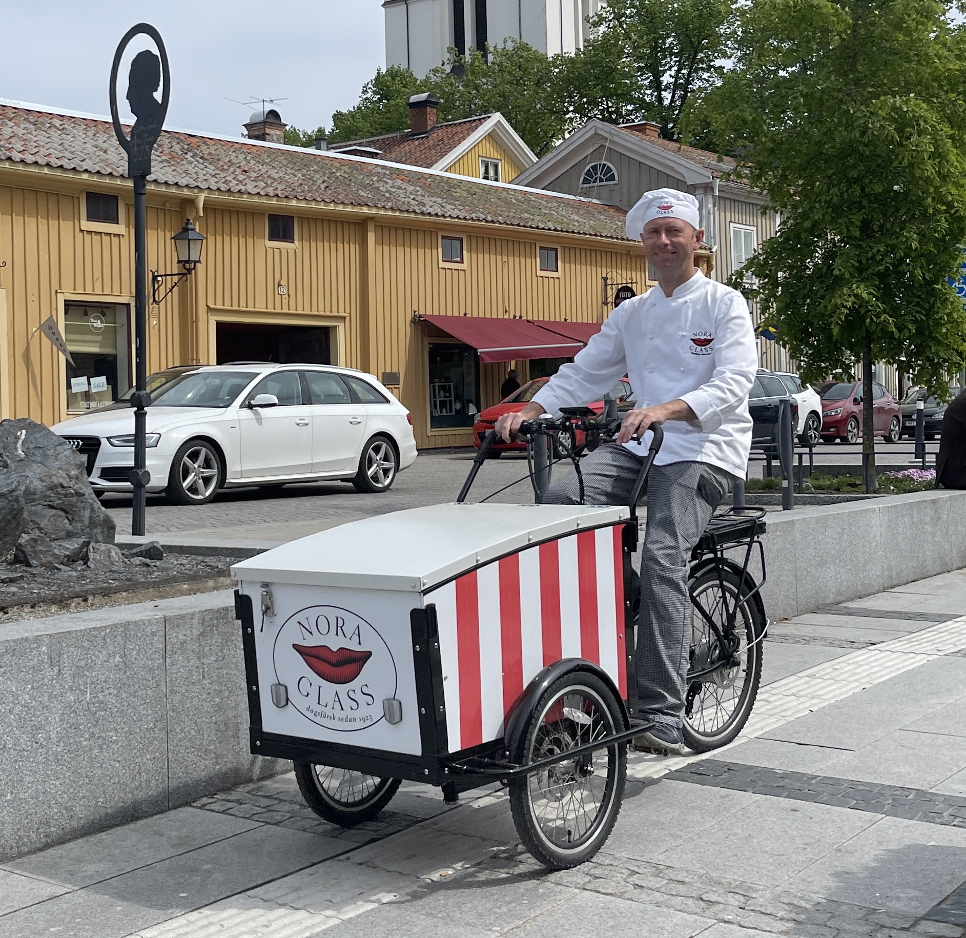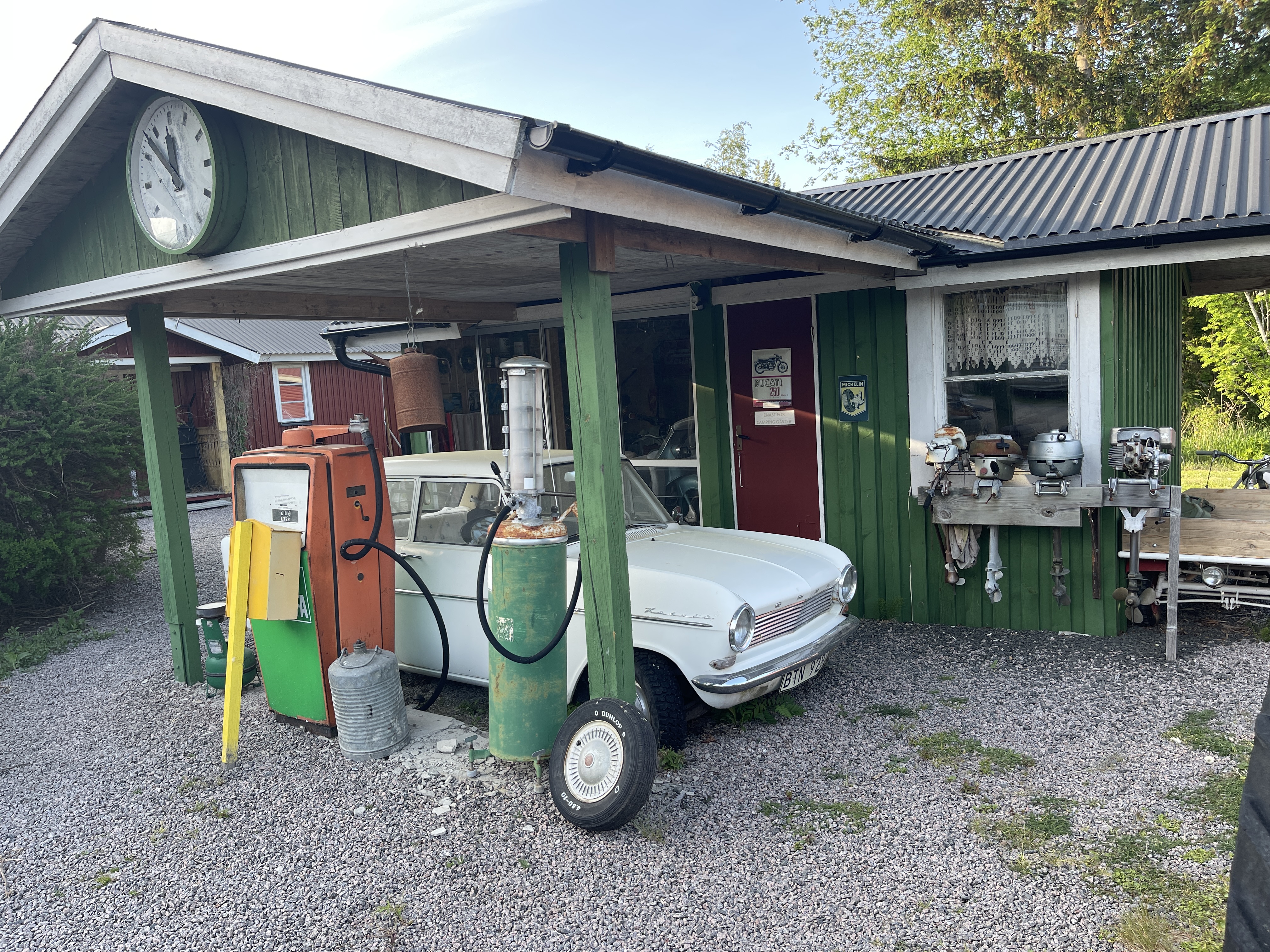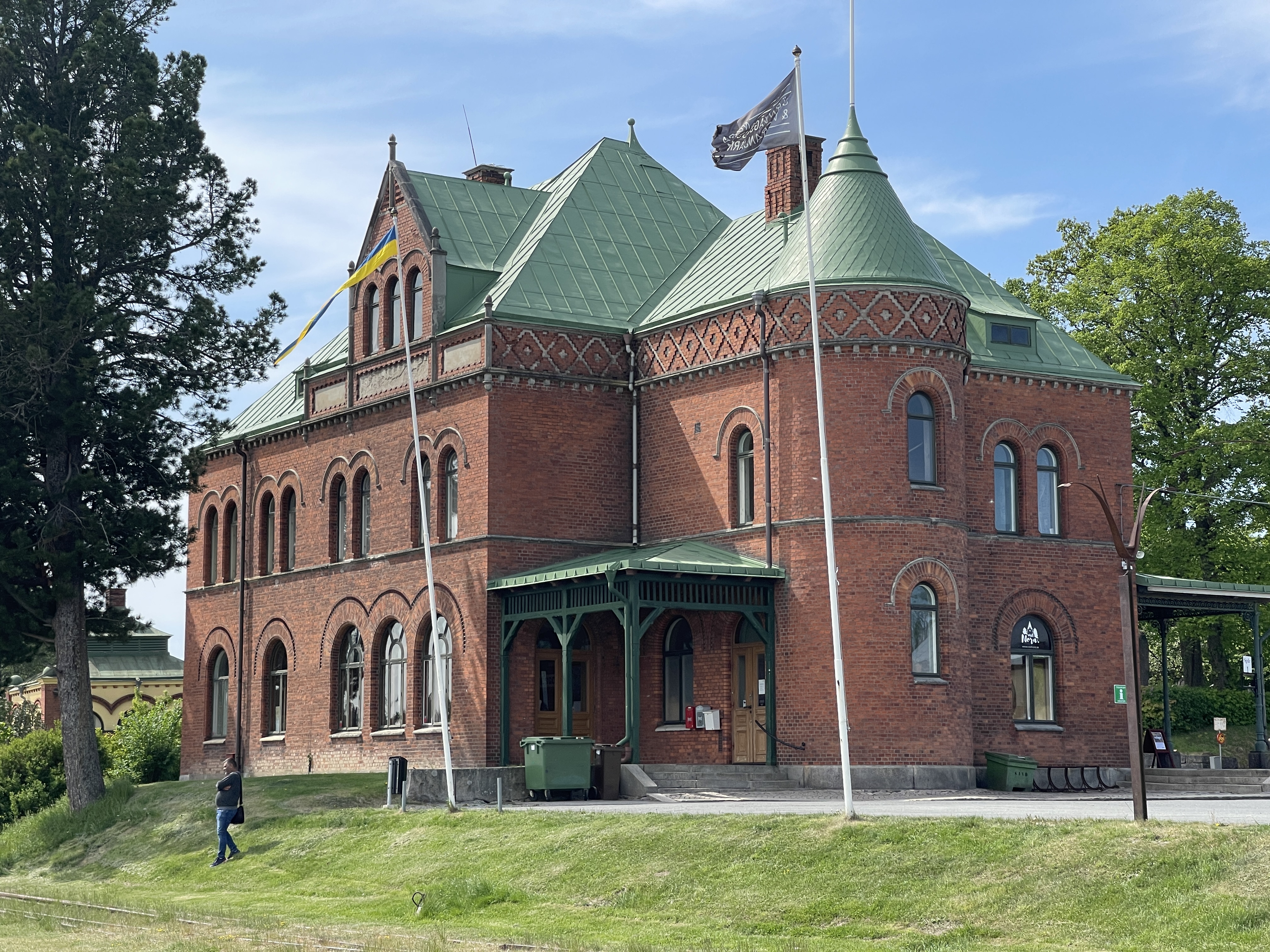 27 mei Nora. Een super gezellig dorpje, bekend om een ijsfabriek met dagvers ijs waar mensen voor in de rij staan. Dat heb ik maar niet genomen want we hadden ook al koffie met gebak, in een nostalgisch café, gehad. Wijn gekocht bij een staatswinkel. Zo wordt dat geregeld in Zweden. Alcohol koop je bij de Systembolaget. Nora heeft een oud en mooi stationsgebouw.Achter het gebouw een hele groep mensen die aan het klussen waren aan oude treinen. Er is ook nog een klein museum. Nog 135 km voor de boeg naar Hagfors.