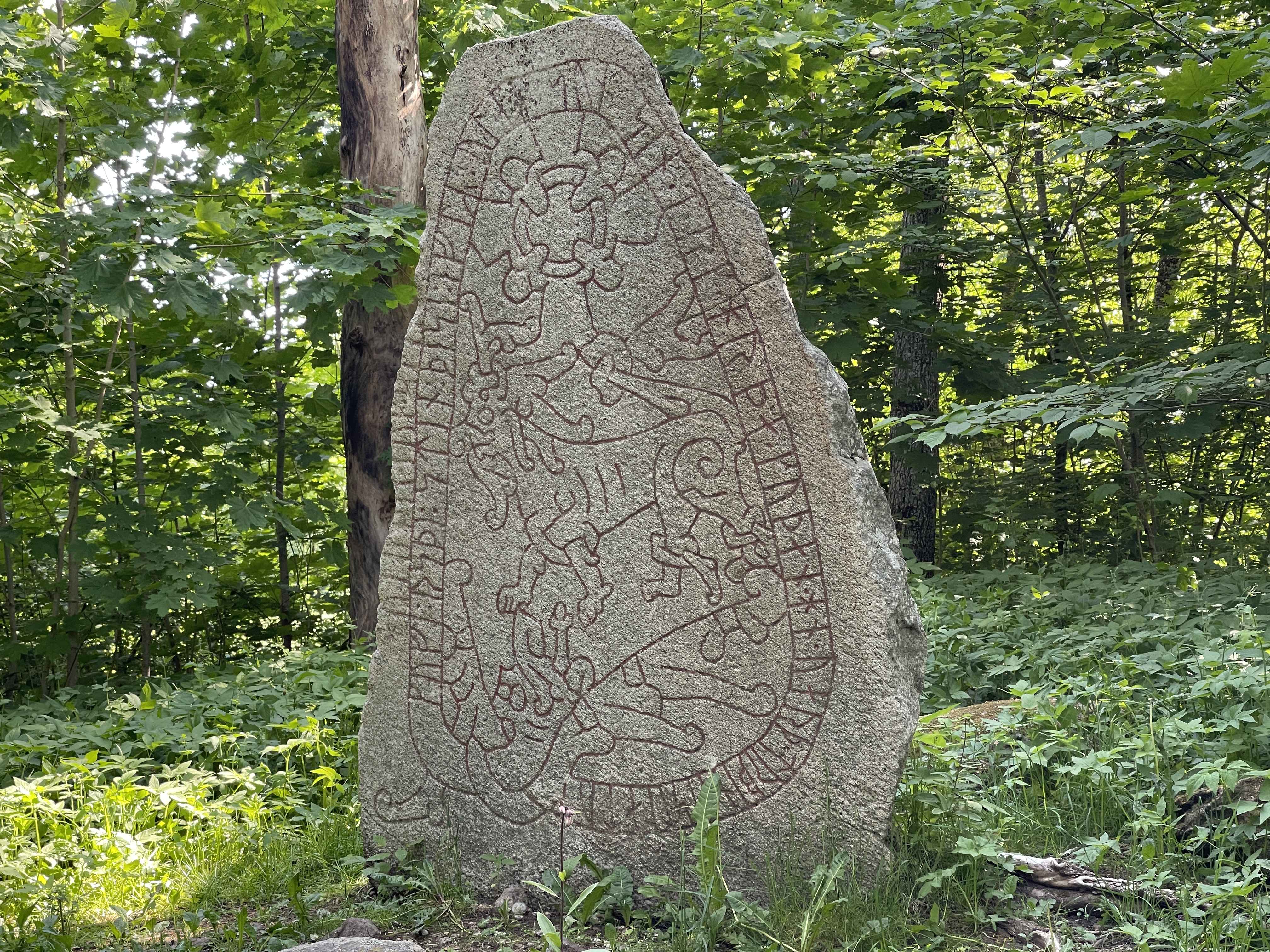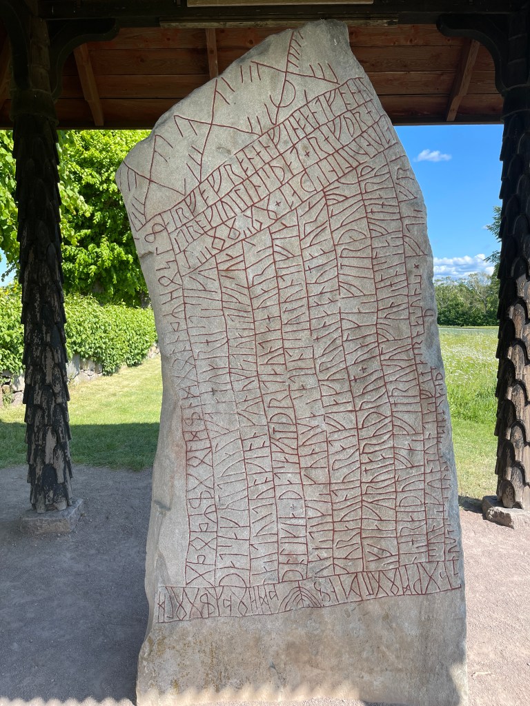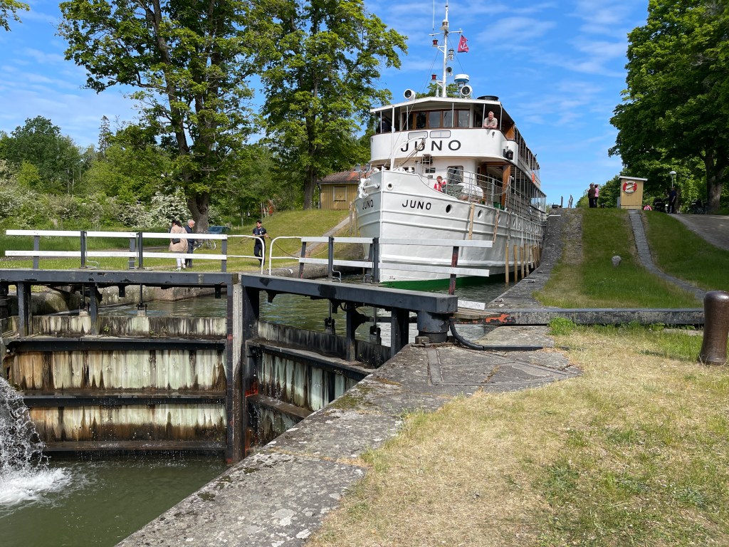 3 juni: Eigen schuld dikke bult. Op mijn hoofd! Stond argeloos te kijken bij de sluizen en kreeg de slagboom op mijn kop. 7 sluizen voor een hoogteverschil van 18 meter. Vanmorgen half tien op de fiets langs het Göta kanaal .Veel te zien en altijd leuk. Het was zaterdag. En voor veel Zweden een lang weekend ivm de Nationale Feestdag dinsdag. Waar we maar niet aan kunnen wennen is dat de Zweden elkaar niet goedendag zeggen. Meestal met fietsen in andere landen wordt dat wel gedaan. Om twaalf uur weer in de camper en via een mooie route naar het klooster Vadstena. Heel druk, parkeren niet mogelijk. Naar de camperplaats gereden en daar maar even kort geparkeerd. Boodschappen gedaan en weer via mooie binnenwegen naar Visjo. Onderweg bij een kerk een Rune steen, voor Zweden hoort dit bij hun kultuur. De Viking tijd. Langs de weg waar we reden zien we bordjes met een bloem, lijkt een beetje op de margrietroute in Denemarken. We kunnen nergens info vinden van deze route. Overnachten op een parkeerplek aan het water waar Lia kon zwemmen. Vanavond na het eten nog 1,5 uur bij het mooie meer gezeten. We hoorden de kraanvogels maar niet gezien.
