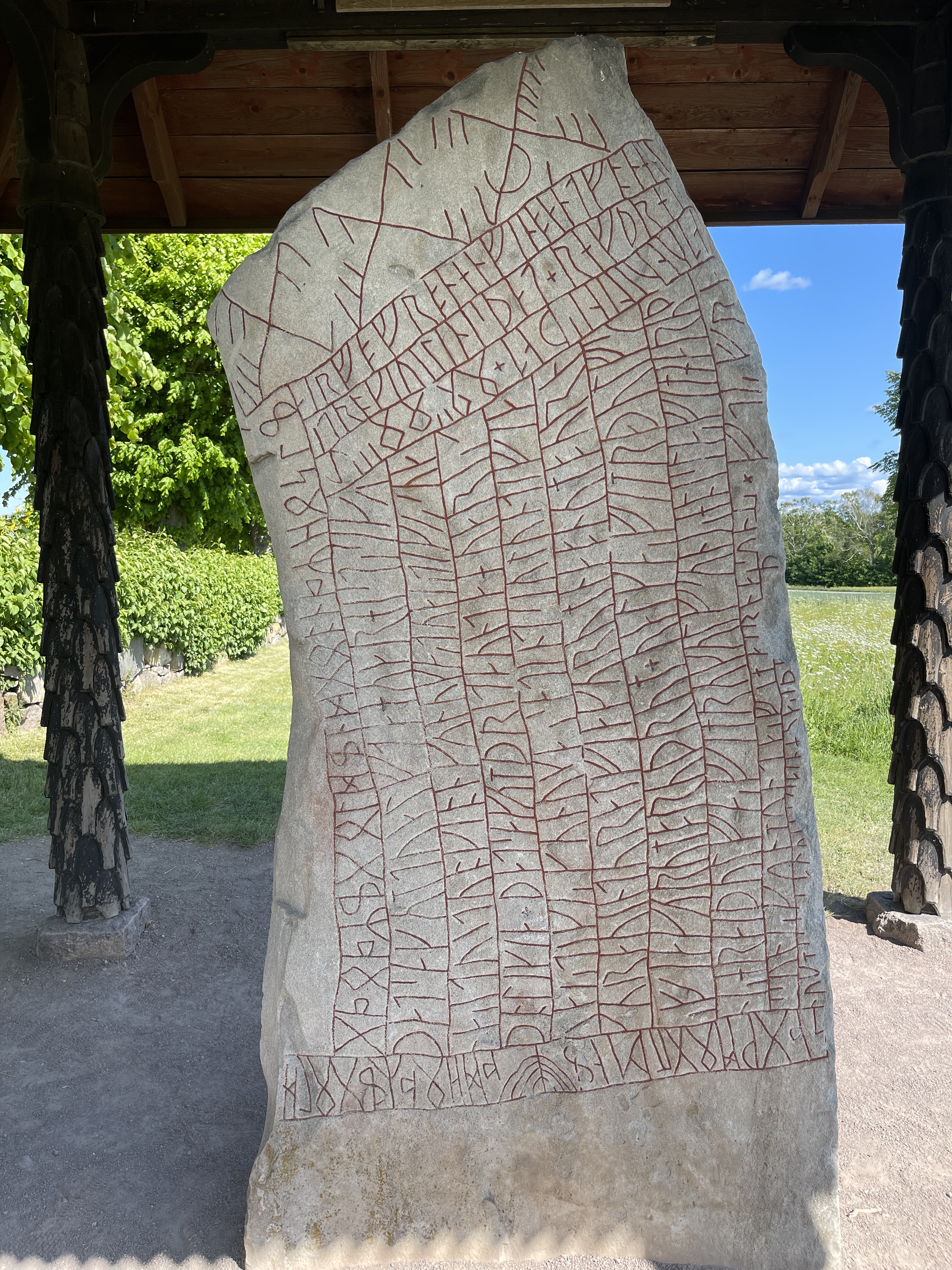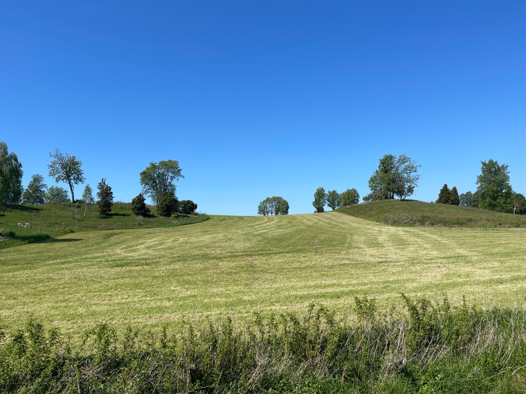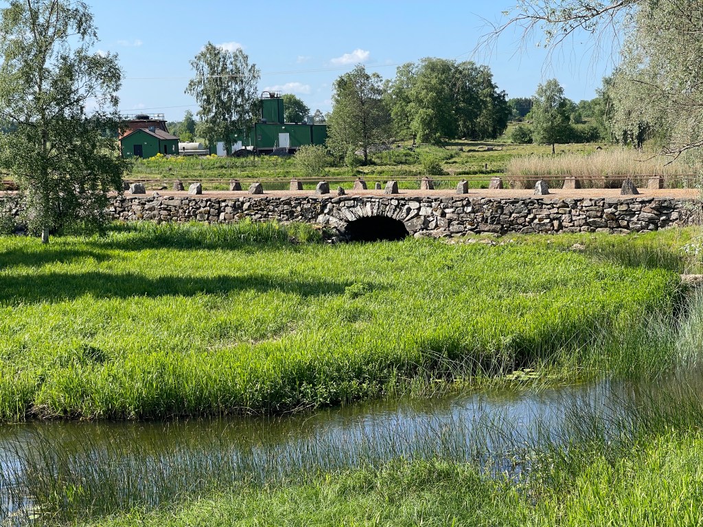 6 juni Vandaag op plek gebleven. De fiets gepakt en via een fietspad in het Ästrap dal terug gefietst naar het leuke restaurant van gisteren en daar een overheerlijk broodje met oa bietensalade gegeten. De foto’s zijn van de oudste brug, de Olsbrostenen deze is bijzonder omdat er in het midden een dier wordt afgebeeld , ruine van Mussla ( kerkje) en van grafheuvels in het gecultiveerde gebied waar zo mooi omheen gemaaid wordt. Onderweg kraanvogels gezien. 40 km gefietst (het fietspad kan je oppikken in Åsarp) onder wederom een strak blauwe lucht.