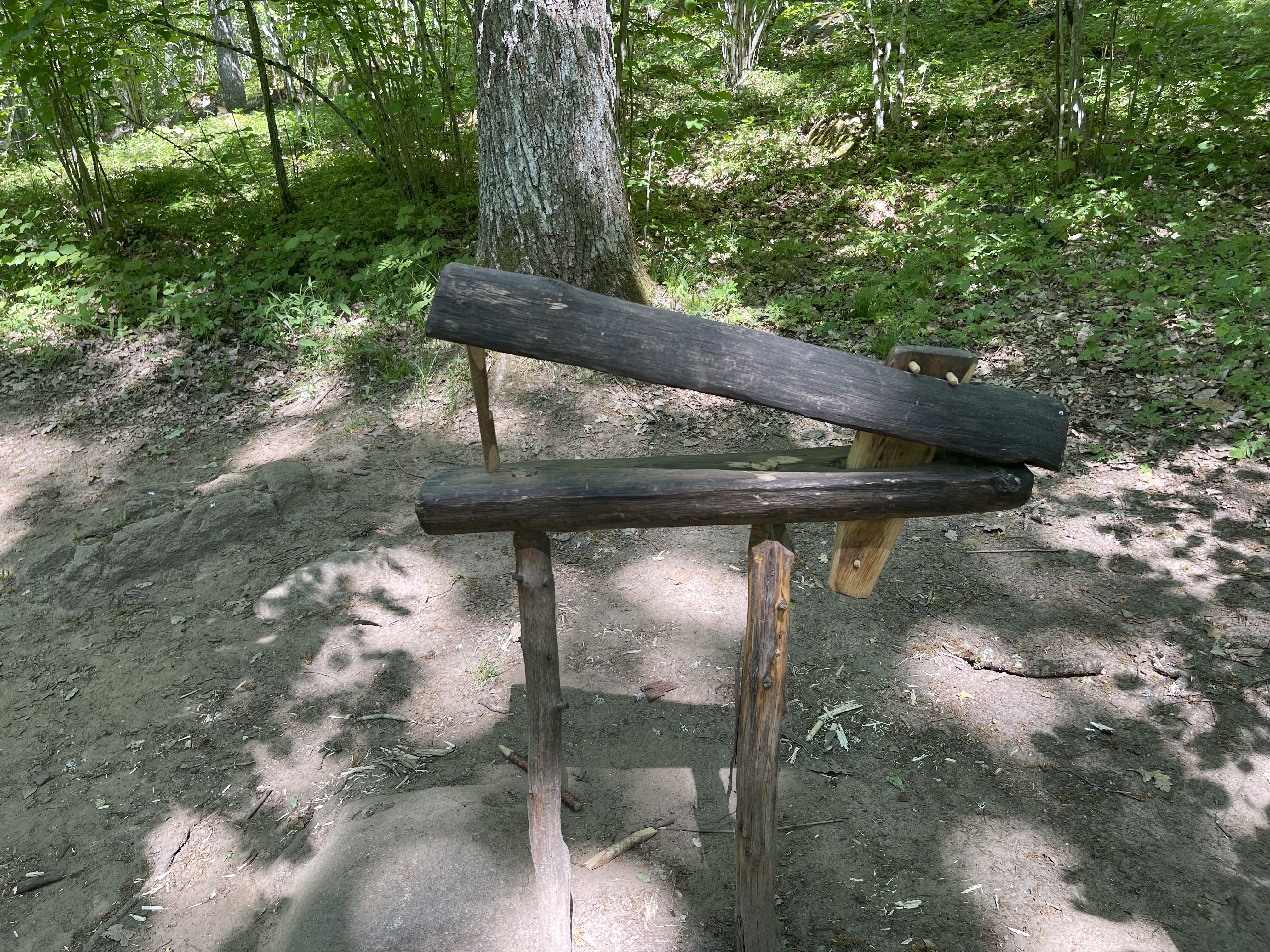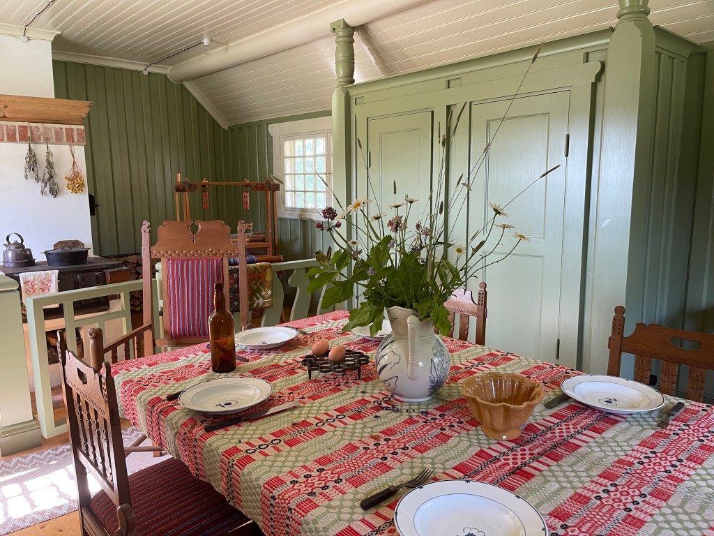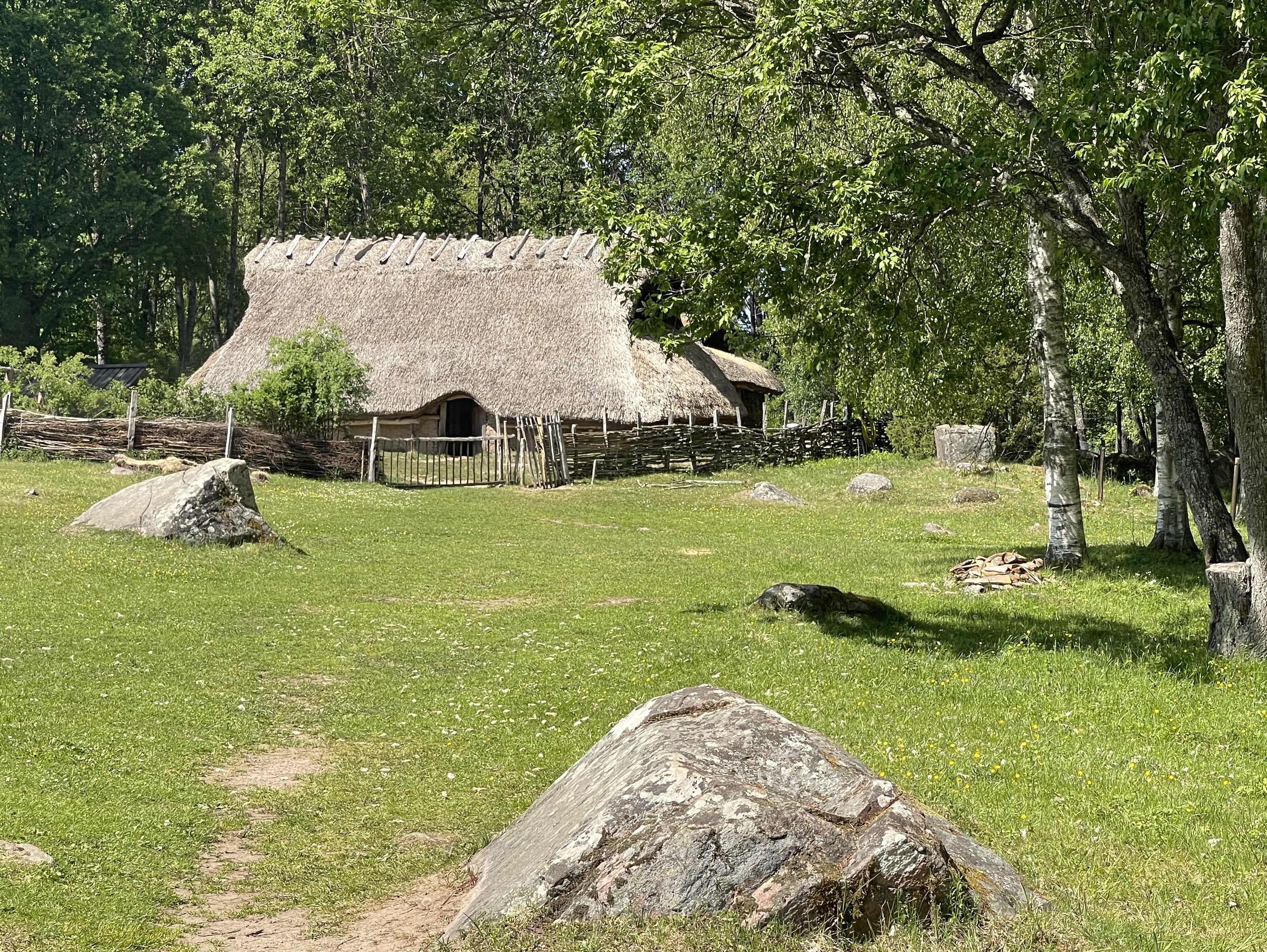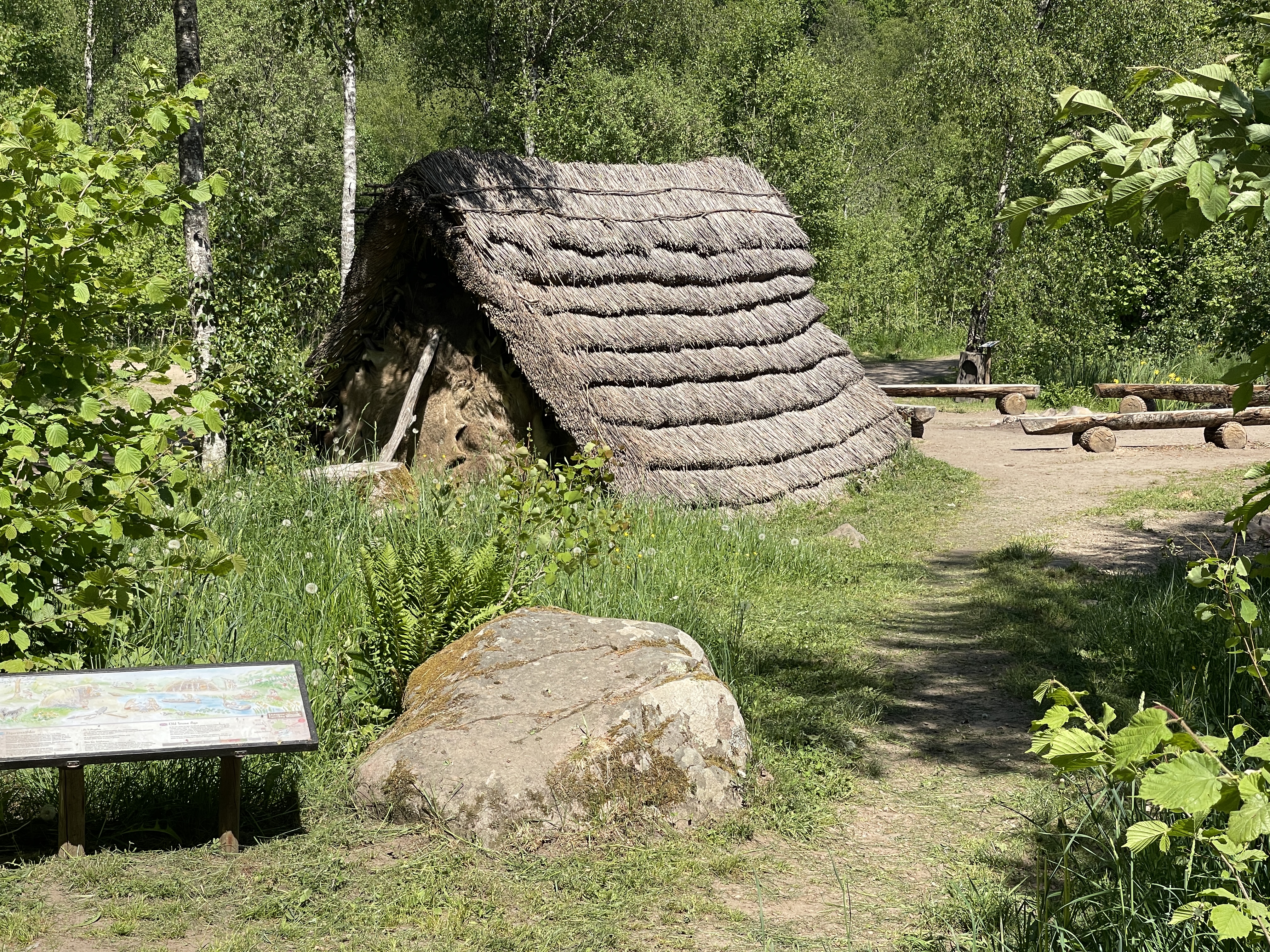 5 juni. Het reisboek adviseerde om koffie te drinken in Blidsberg. En dat was een goeie tip. De zitjes zijn verspreid over kleine eilandjes in de rivier Aträn. En het gebak is heeeeeel erg lekker. Het ligt langs de rijksweg 46. 12 minuten verder de camperplaats bij een klein en heel aardig open lucht museum. Voorbeelden van de stenen- ijzer- en bronstijd. De val op een van de foto’s was om eekhoorns te vangen. Voor vlees maar vooral voor vacht. Vanmiddag lekker gerelaxt op dit mooie plekje.