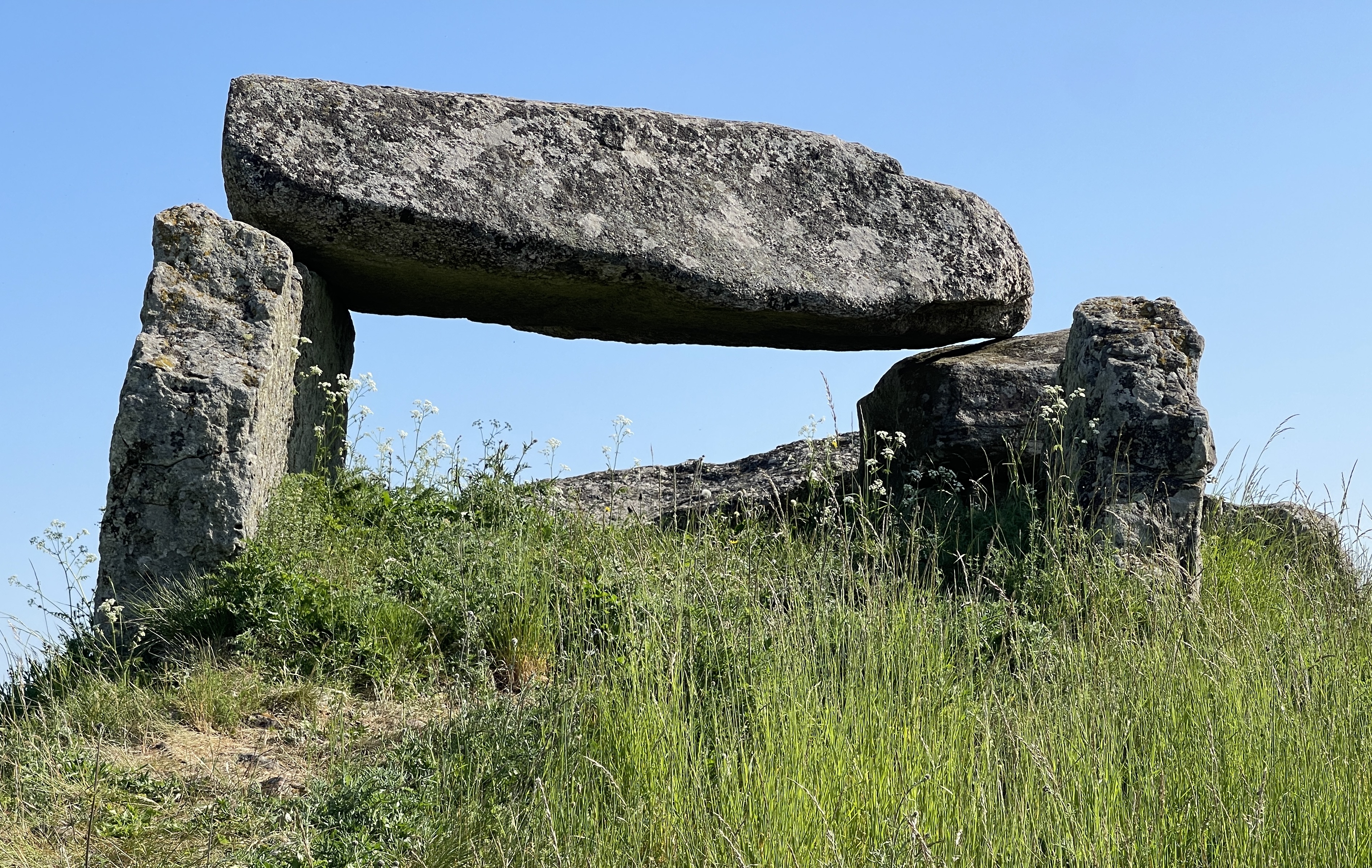 7 juni. Richting Falköping. Onderweg een kijkje genomen bij Luttra gangrift. Een van de vele megalithische graven rond Falbygden. Waarschijnlijk de meest spectaculaire van het hele land. 5.000 jaren oud. Hoe kreeg je toen die steen blokken op zijn plek? In Falköping zoek ik naar een tandarts. De particuliere tandartsen willen niet helpen. Toeristen kunnen naar een staats kliniek gaan op het ziekenhuis terrein. Ik kreeg een afspraak voor de volgende dag en zocht een camping in de buurt. 22,00 euro zei campercontact maar we moesten 37,50 betalen. Camping ligt mooi op de Mosseberg. Het zwemmeer is een onderdeel van een heel sportcomplex, ook skiliften.