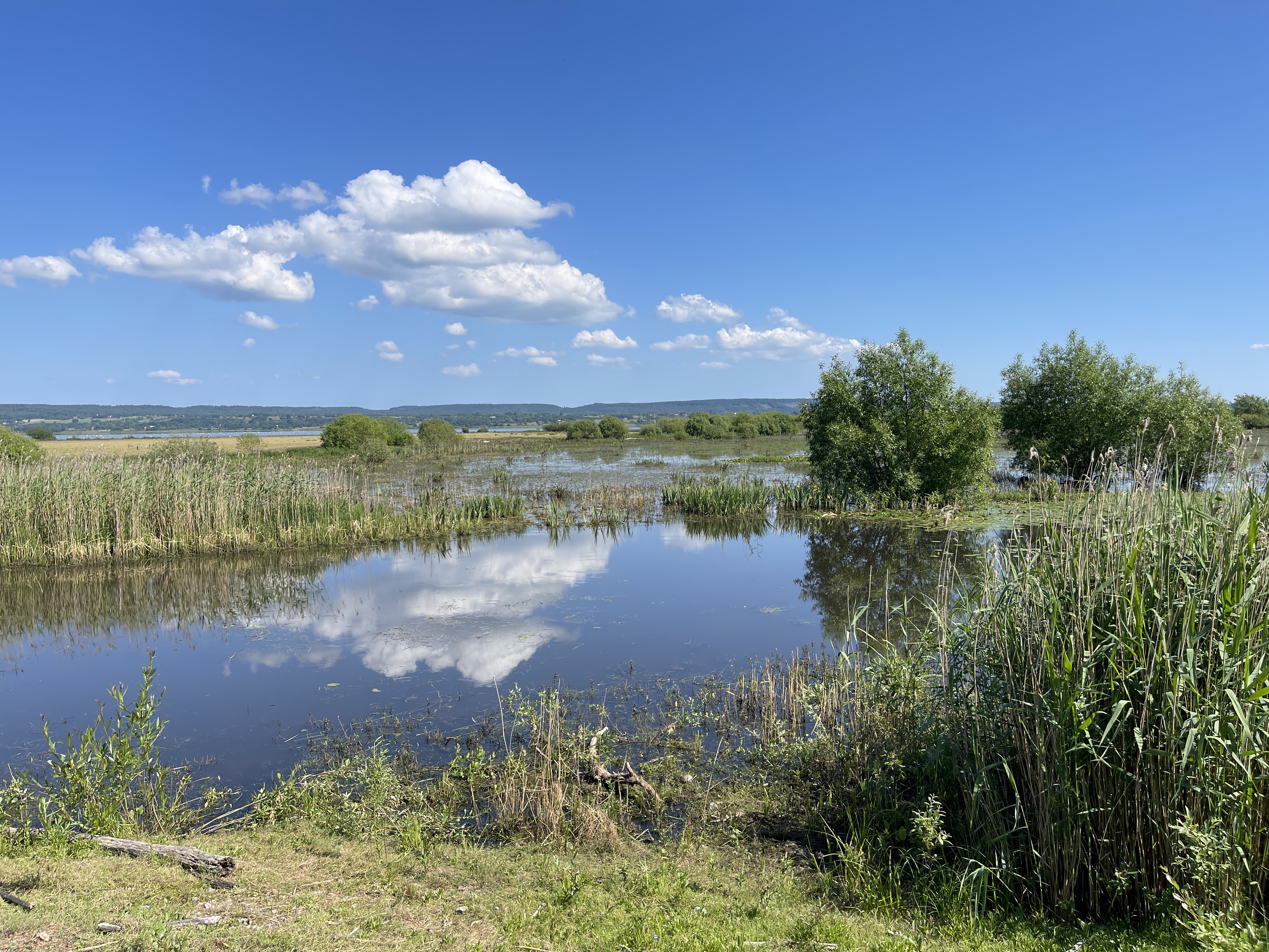 Volgende stop is het Hornborgasjön meer. Midden april tot midden mei zijn hier duizenden vogelaars die de dansende kraanvogels willen zien. Nu stonden we met een Belgisch echtpaar op de parkeerplaats. Samen besloten we een overnachtingsplekje aan het meer te zoeken. Park4Night had een mooie plek. Moesten we wel 4 km dirt road voor rijden. Wat een stof!! Maar de moeite waard. Eenmaal de camper op een picknick plek neergezet wilden we naar de vogelkijkhut lopen en voor het eerst liepen we moeizaam, het was warm. De eerste vogel die ik hoorde was de karekiet in het riet en ik kon hem ook zien. Heel bekend want thuis zit deze vogel (de kleine) nog wel eens onder mijn slaapkamer raam. Hier hoorde je vooral de grote karekiet, die je ook makkelijker ziet omdat hij hoger in het riet zit.
