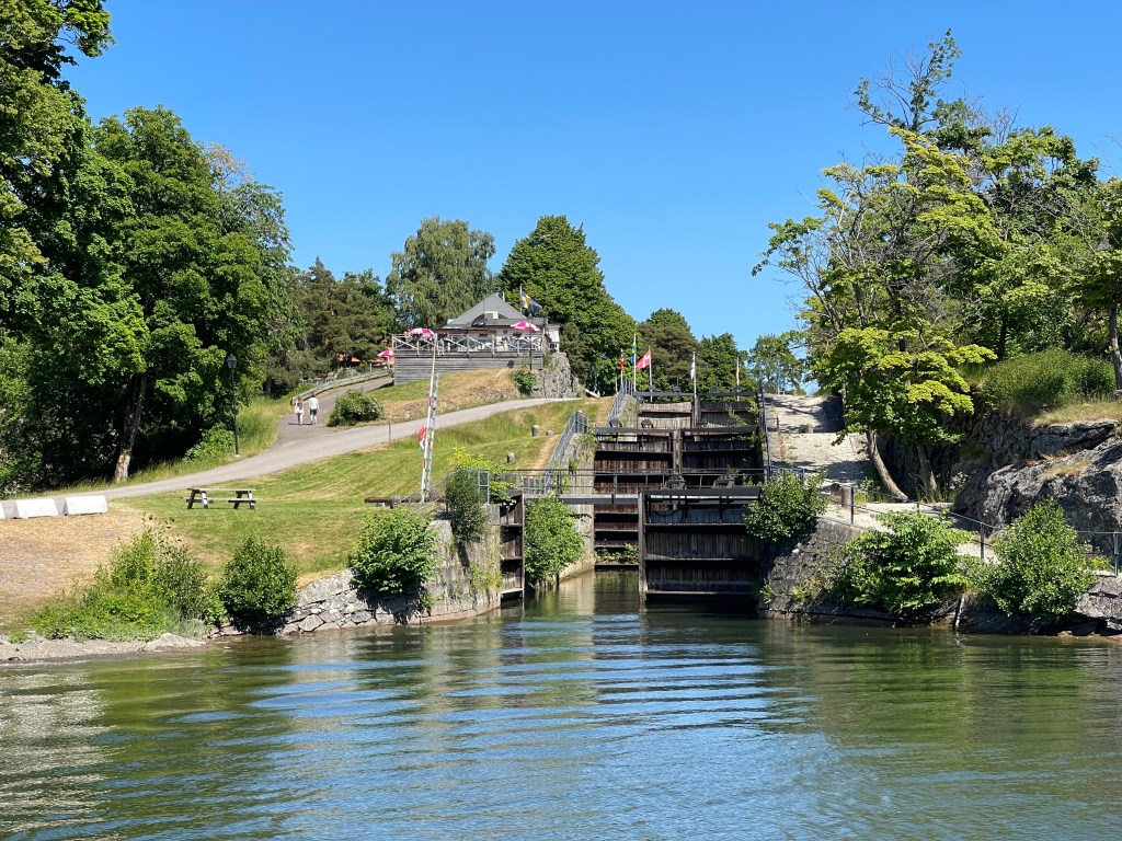 2 juni. Grote schrik! Vanmorgen in afwachting reparatie fiets Lia. Om half twaalf klaar en om twaalf uur rijden. Maar…na een uurtje wilde ik op een parkeerplaats stoppen om de kaart te bekijken. Per walkietalkie doorgegeven aan Lia, achter elkaar op de parkeerstrook. Lia komt naar mij toe en Bong! Ik schrok me het apezuur. Lia’s camper was tegen mijn achterkant (van de camper hè). Bumper behoorlijk kapot, tijdelijk met ductape gerepareerd. Even bijkomen op het parkeerterrein van het Sternsund kasteel, ook weer op een schitterde plekje. Op weg naar het Gota kanaal eerst gestopt bij de Borenshult sluizen. Daarna naar de Berg sluizen. We overnachten op een afgescheiden gedeelte van een parkeerplaats. Nu super rustig maar aan de grootte van het terrein kan je wel afleiden hoe druk het later in het seizoen zal zijn. Je krijgt een kaartje mee om de doucheruimtes te gebruiken, waar je wel een stukje voor moet lopen.