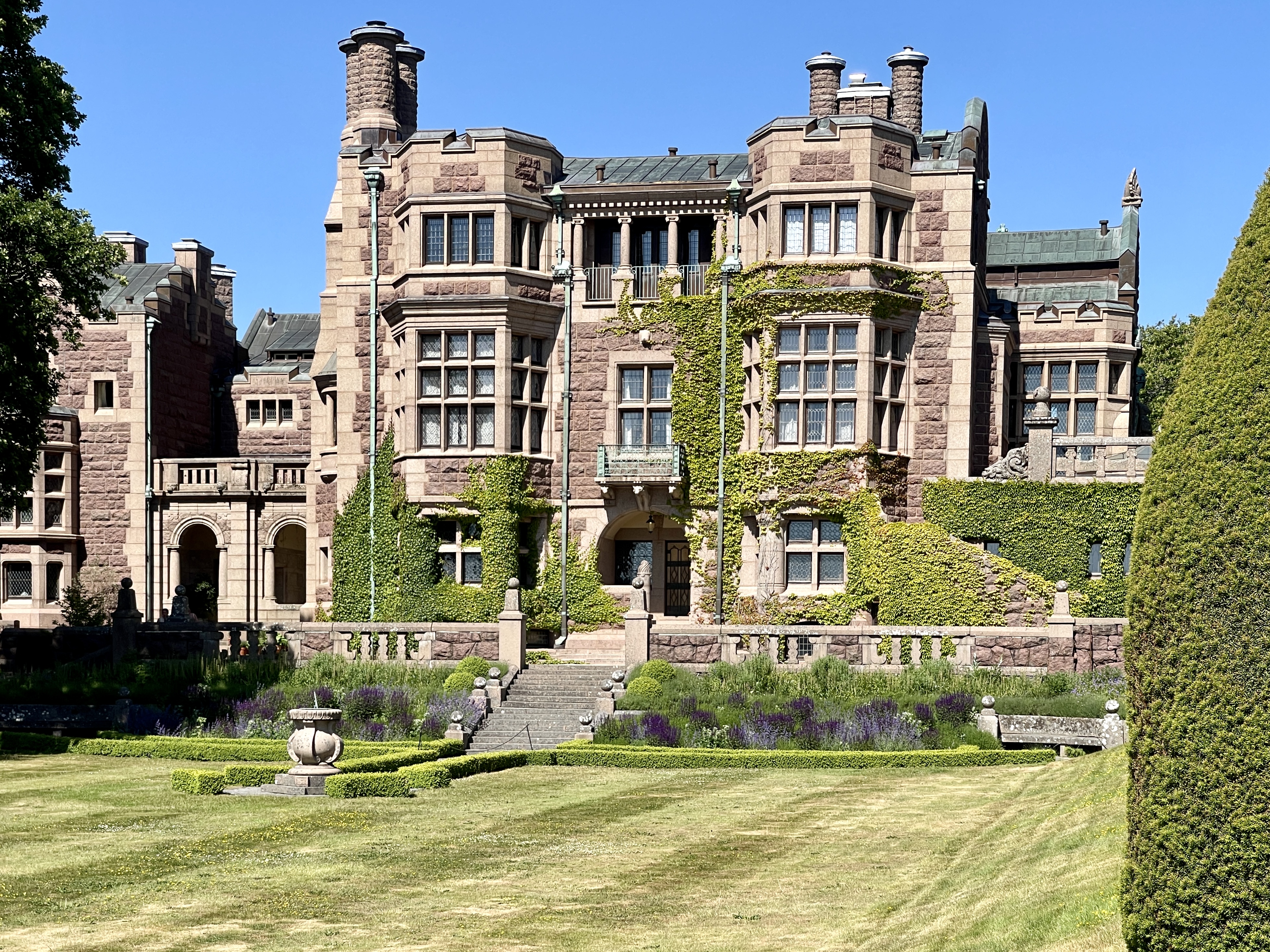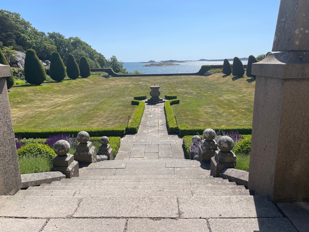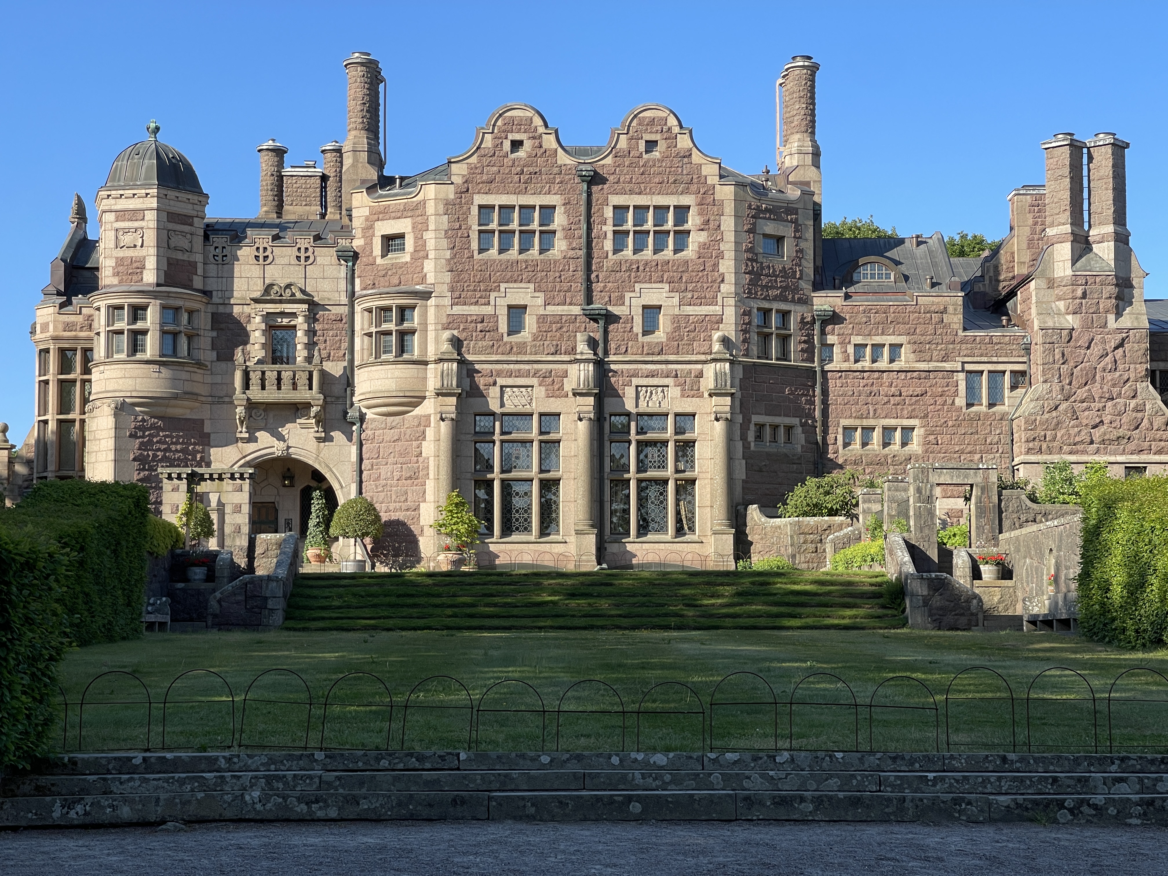 11 juni. Lia wordt door haar zoon dagelijks op de hoogte gehouden over de stand van zaken mbt haar poes. Lia wil liever naar huis want het gaat niet goed. We besluiten nog naar het slot Tjolöholms bij Kundbacka te gaan. Gebouwd door een Engelse dame. Samen met haar man alles tot in detail uitgedacht en toen begonnen werd met de bouw stierf haar man. Ze heeft zelf het bouwproces dat zes jaar duurde doorgezet. Mooi gebouw en van binnen ongelooflijk veel fijne details. Zelfs de lichtknopjes waren kleine kunstwerkjes. Echt van genoten. Lady Dickson liet voor haar personeel heel aantrekkelijke huisjes bouwen. Sociale Dame. Morgen richting Helsingor voor de ferry’s. woensdagavond thuis. De poes van Lia is opgenomen in de dierenkliniek ivm nierfalen. Helpt de behandeling dan kan poes donderdagochtend opgehaald worden en dan is het fijn dat Lia dat zelf kan doen. We overnachten op de cp bij het slot.