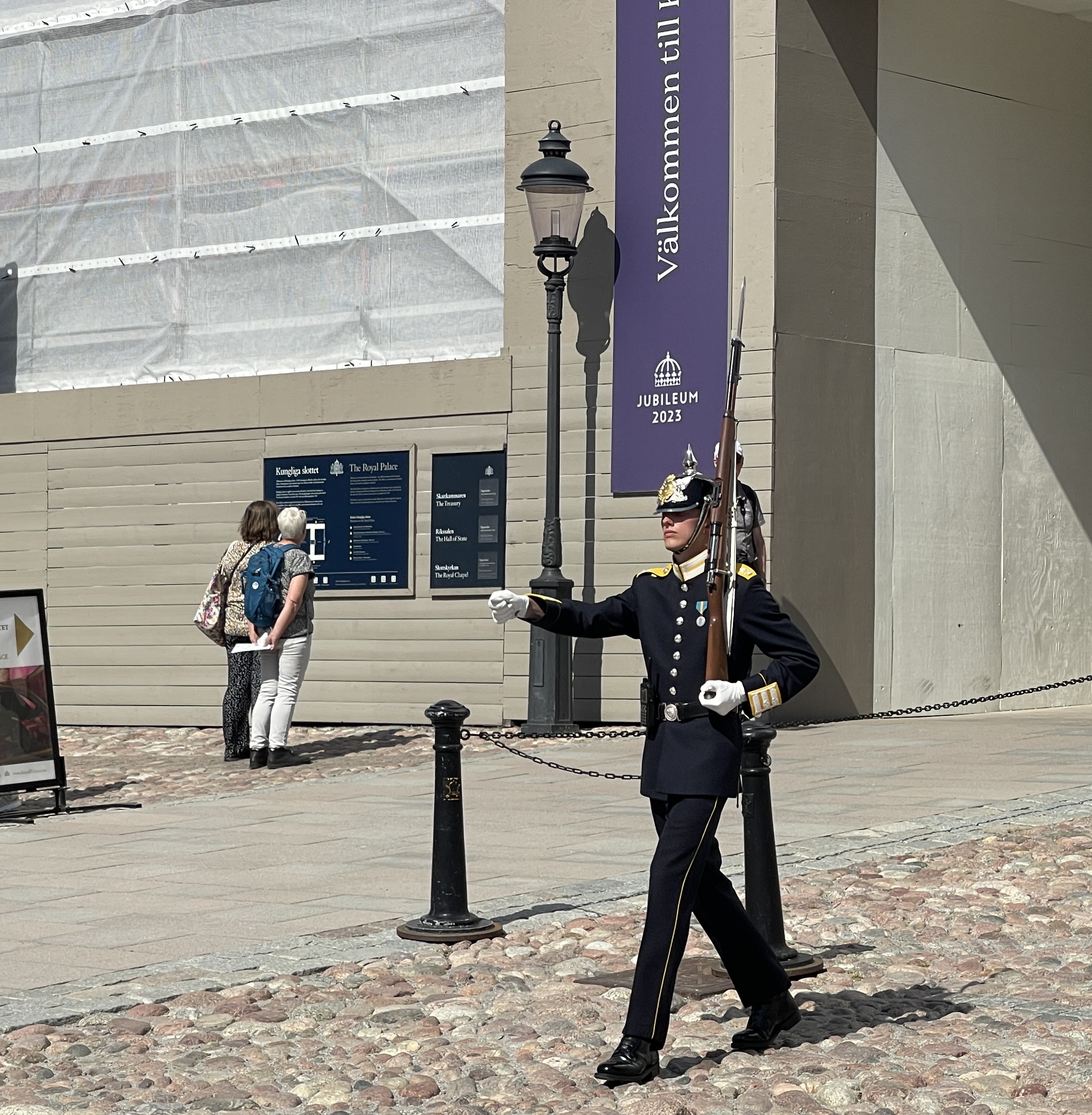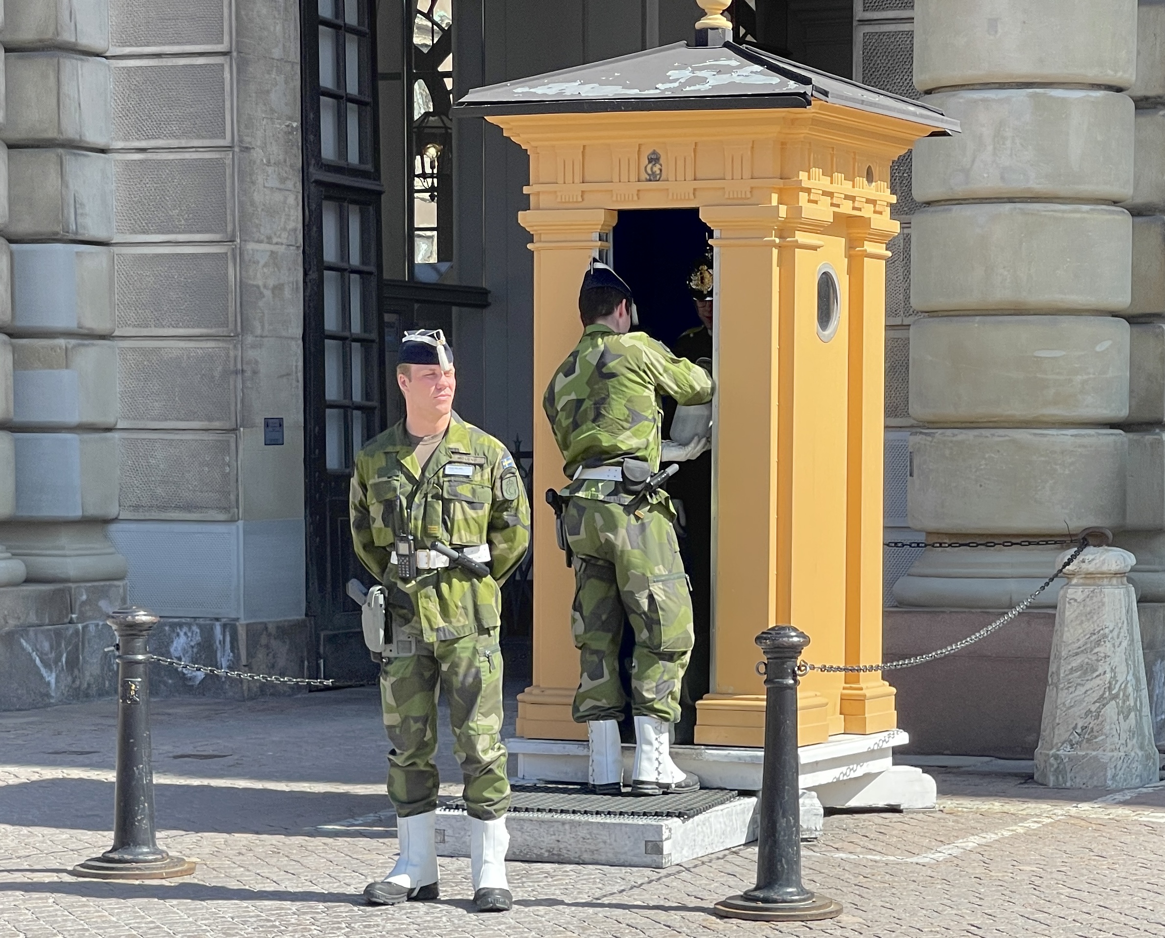 Honger en dorst krijgen de paleiswachten natuurlijk ook. Op de foto met de groen geklede militairen krijgt de wacht eten en drinken. Het wordt zo discreet mogelijk gedaan zodat je niet kan zien dat de wacht eet. Grappig detail: Lia en Jolanda bekijken een bord aan de muur en hebben helemaal niet in de gaten dat er aflossing van de wacht aan de gang is.