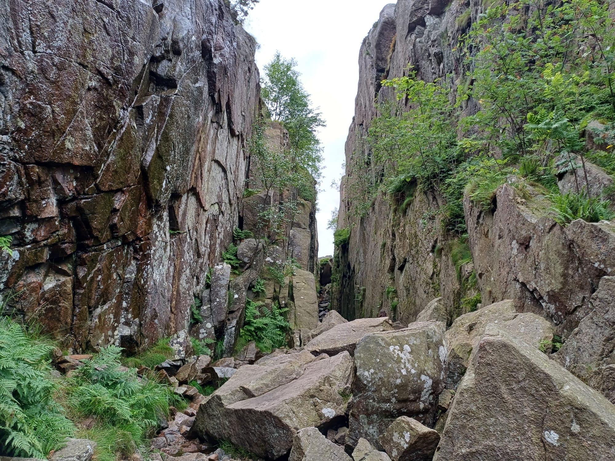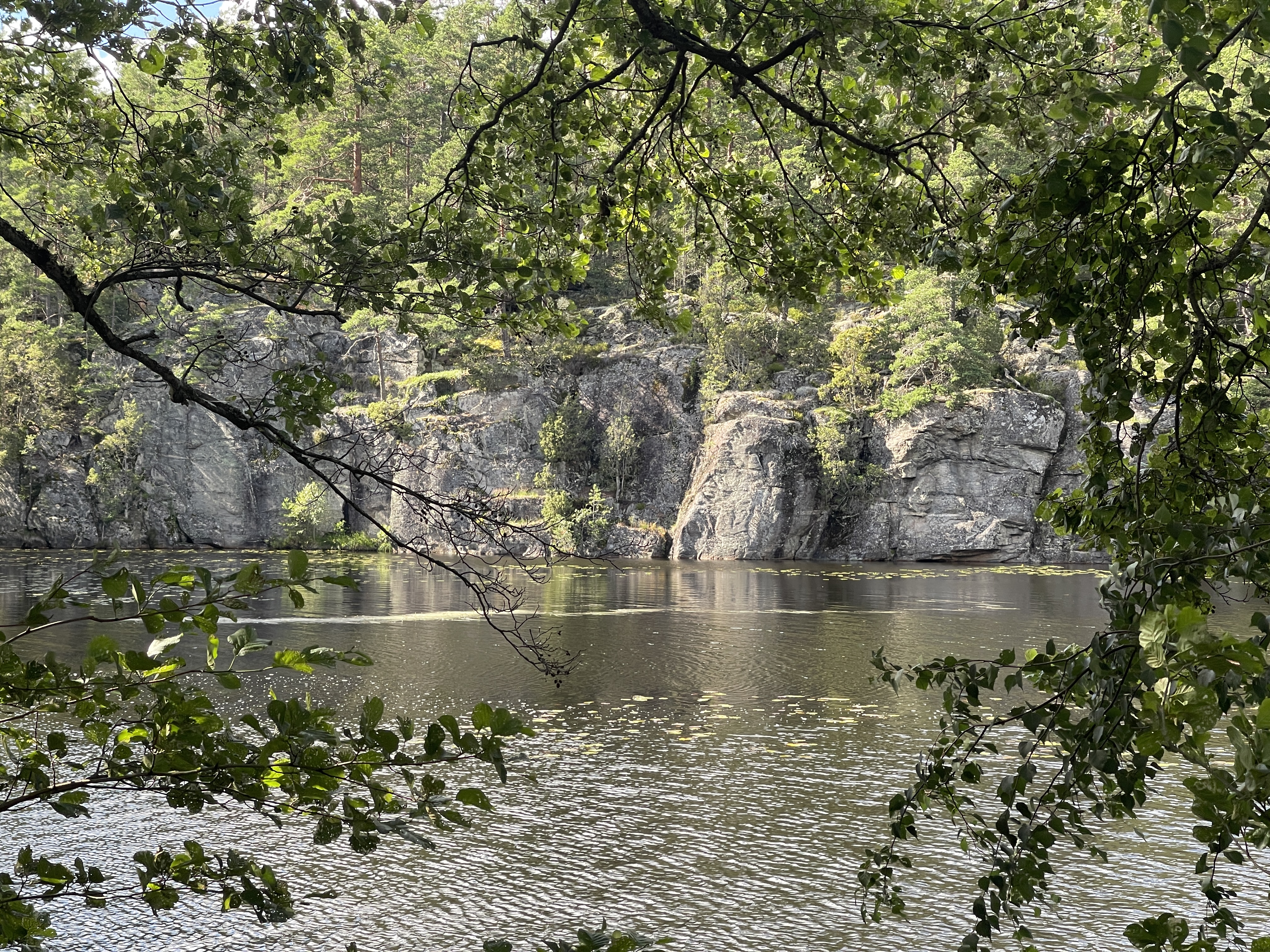 Bij de eerste twee plaatsen tekeningen uit de Bronstijd. In Aspeberget zie je tekeningen begin van de ijzertijd. Daarna naar Fjälbacka een schilderachtig kustplaatsje. Maar oh wat een drukte. We reden vast en moesten draaien. Geen parkeerplaats te vinden. We gaven de moed al op, maar opeens de oplossing: een smal steil weggetje naar een sportveld. De fietsen eruit en gaan. Mieke wilde nog graag de kloof zien. De foto is van Mieke. Ik ben beneden gebleven.