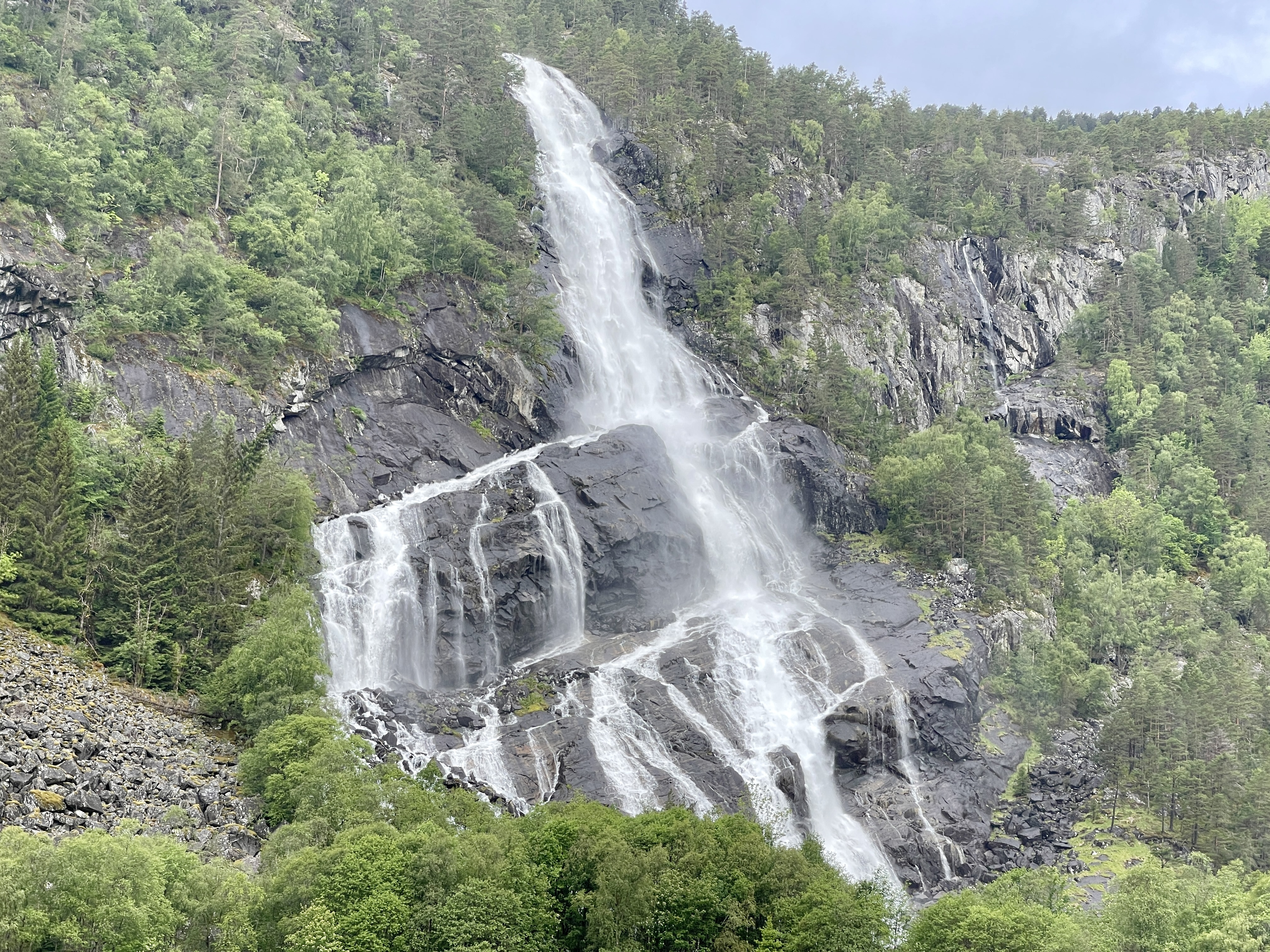 01-07 Half zes wakker vandaag door de muggen. Ik op jacht en dacht daarna nog even te kunnen slapen, maar nee hoor, nog steeds muggen. Ik had er 25 dood en was natuurlijk klaar wakker maar nog steeds muggen. Dakraampje maar dicht gedaan. Tijdens het rijden nog steeds last van die lastige beestjes. Veel gereden vandaag. We wilden naar de Stoforsen waterval. En het was de moeite van het rijden waard. Ik heb met stok (gevallen, enkel) de wandeling gemaakt. Ging lastig maar heb het gedaan. Mooie plek met spannende picknick plaatsen.