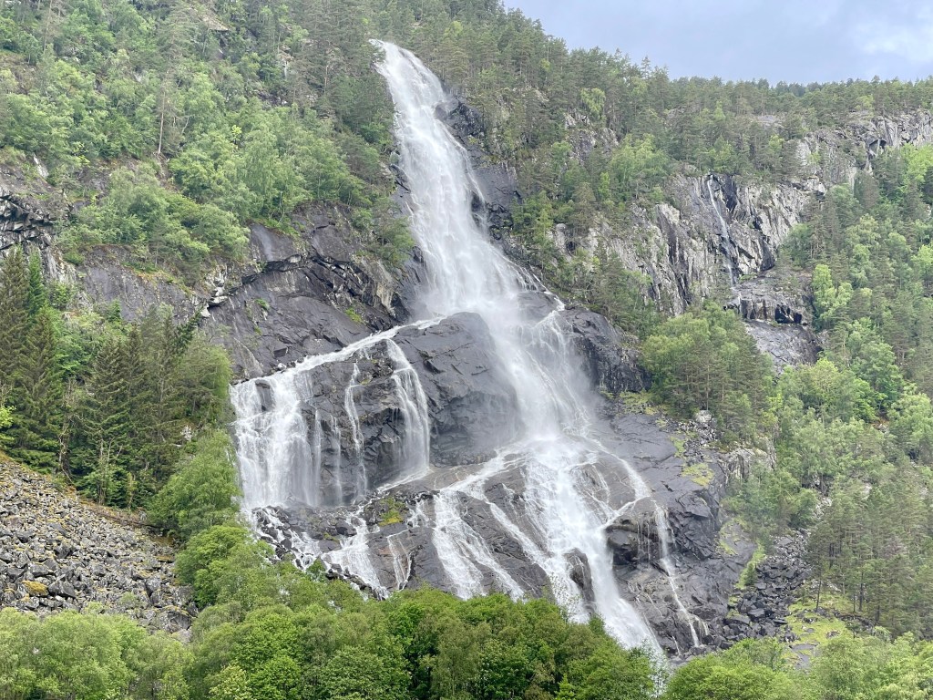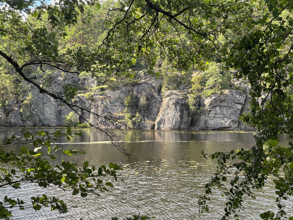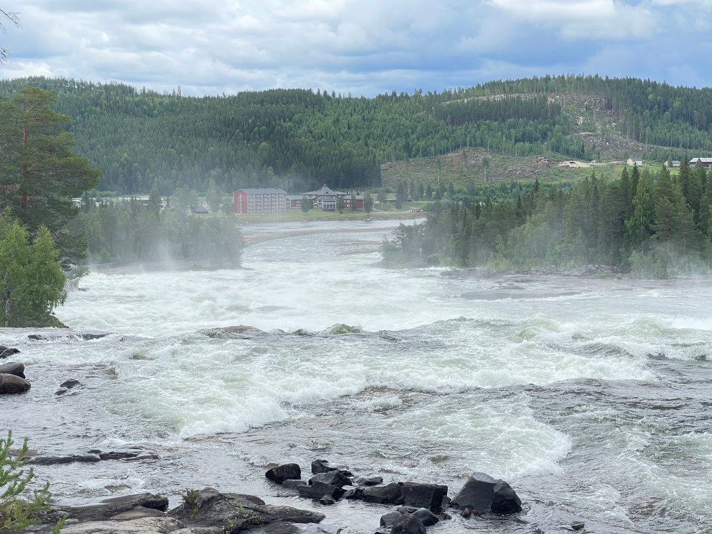 We hebben vandaag wat extra kilometers moeten rijden voor de Ristafallet. Die ligt op den heel afgelegen plaats. Het bordje van de plek was nauwelijks te vinden. De waterval ligt een stuk lager dan de weg. Zo’n pad naar beneden was mij te steil. En dan rijden we de 321. Mooie weg open aan een gigantisch meer. Grote boerderijen, bruine koeien en grote particuliere huizen.