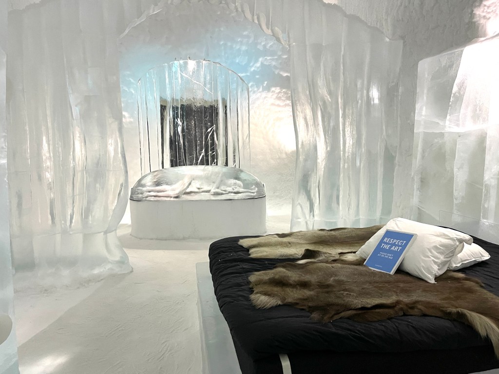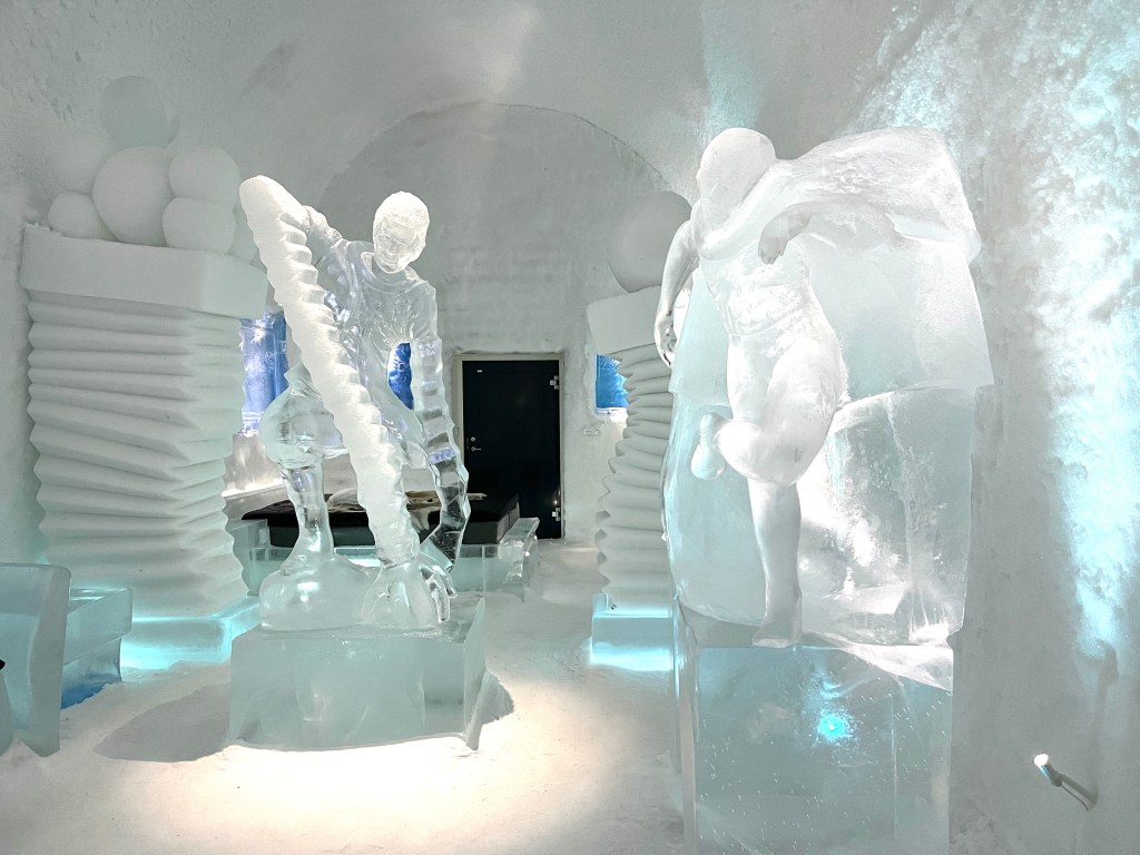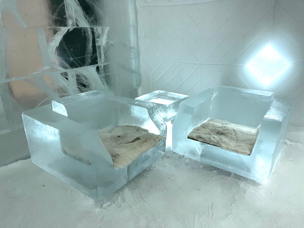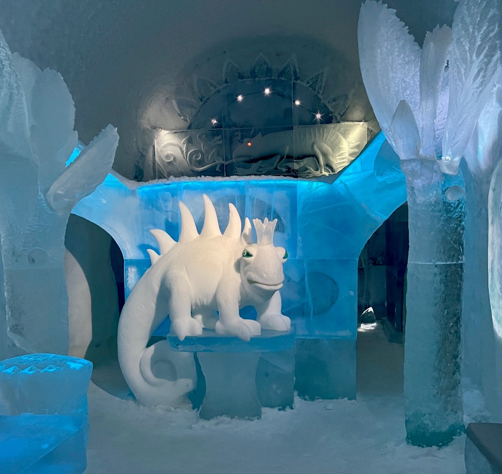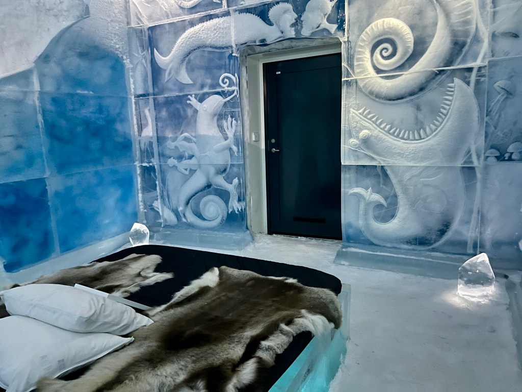 Verder naar Jukkasjärvi naar het IJs Hotel. Dat was echt een hele belevenis. Vijf graden onder nul en de energie die daar voor nodig is wordt opgewekt door zonne-energie! Je krijgt een dikke cape aan bij binnenkomst.