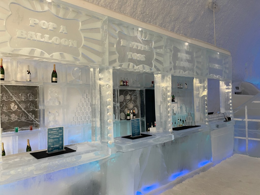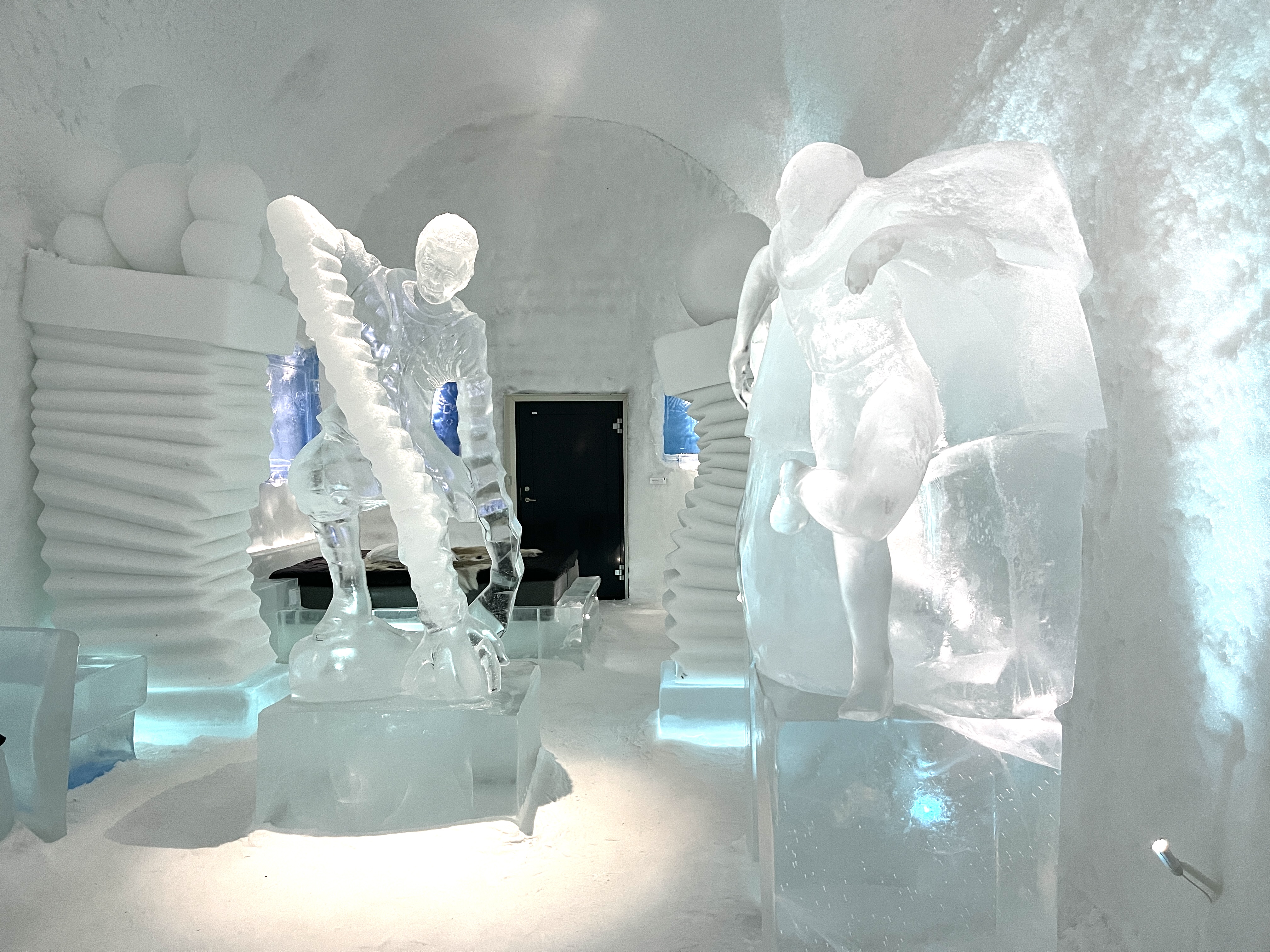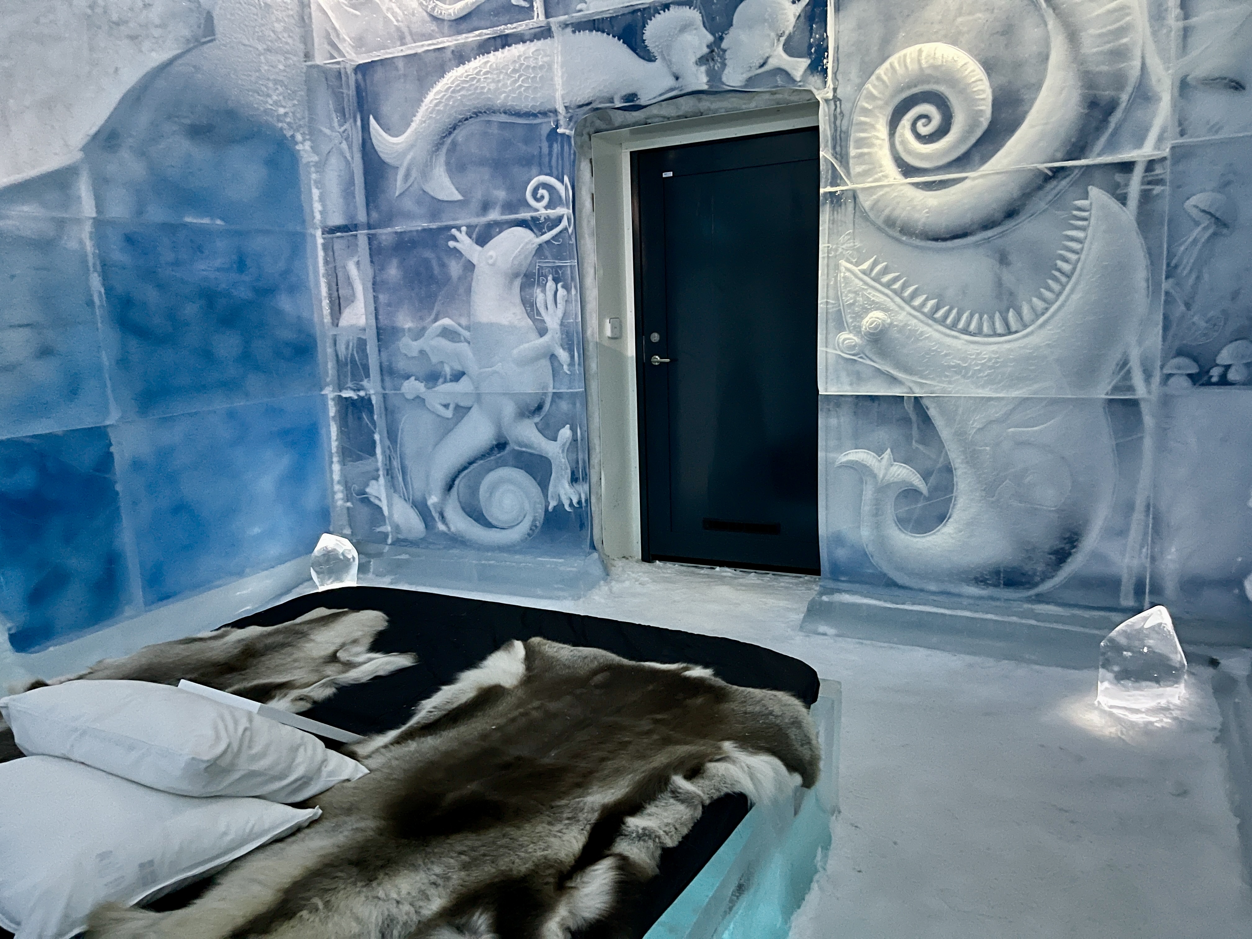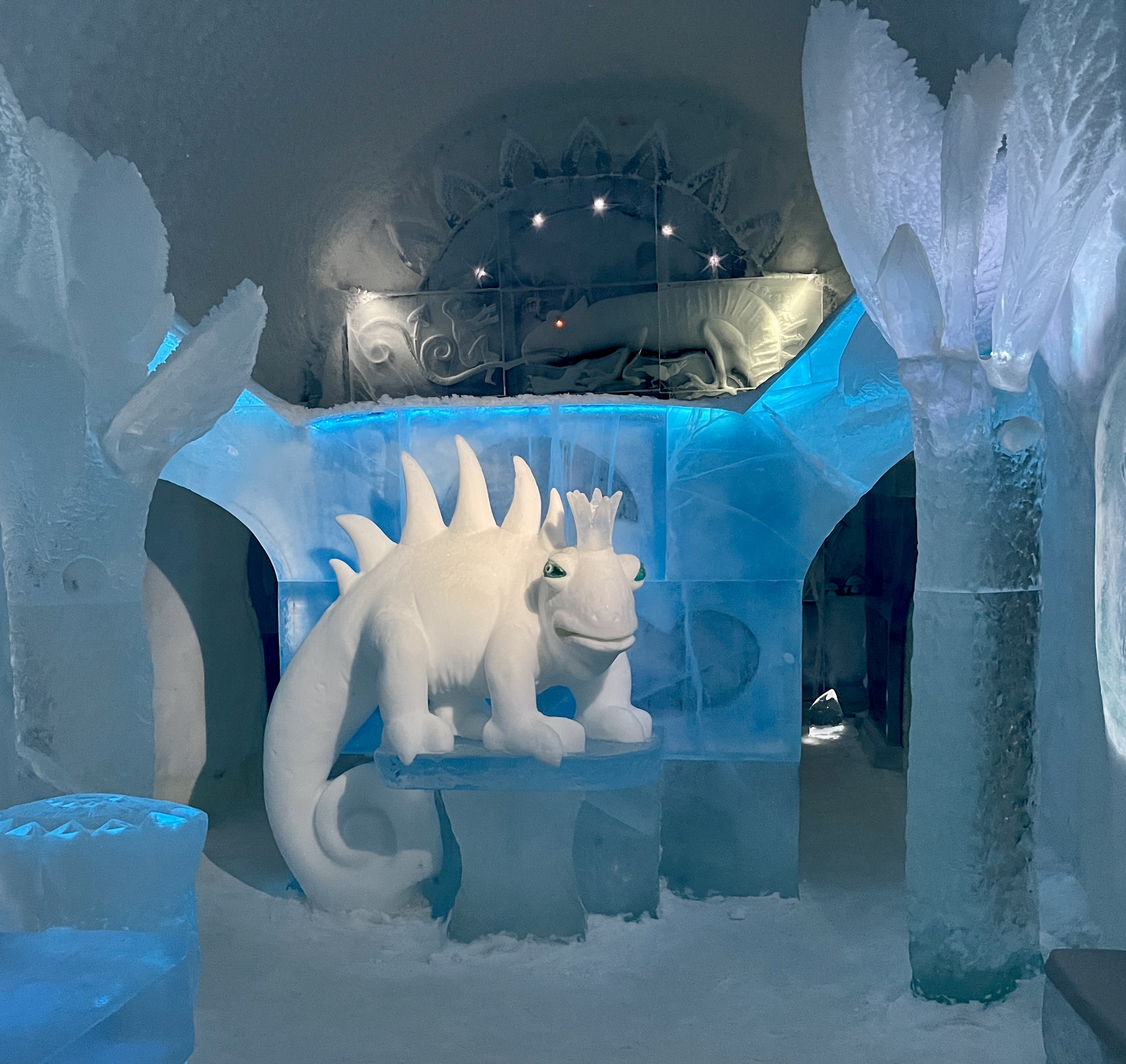 Verder naar Jukkasjärvi naar het IJs Hotel. Dat was echt een hele belevenis. Vijf graden onder nul en de energie die daar voor nodig is wordt opgewekt door zonne-energie! Je krijgt een dikke cape aan bij binnenkomst.