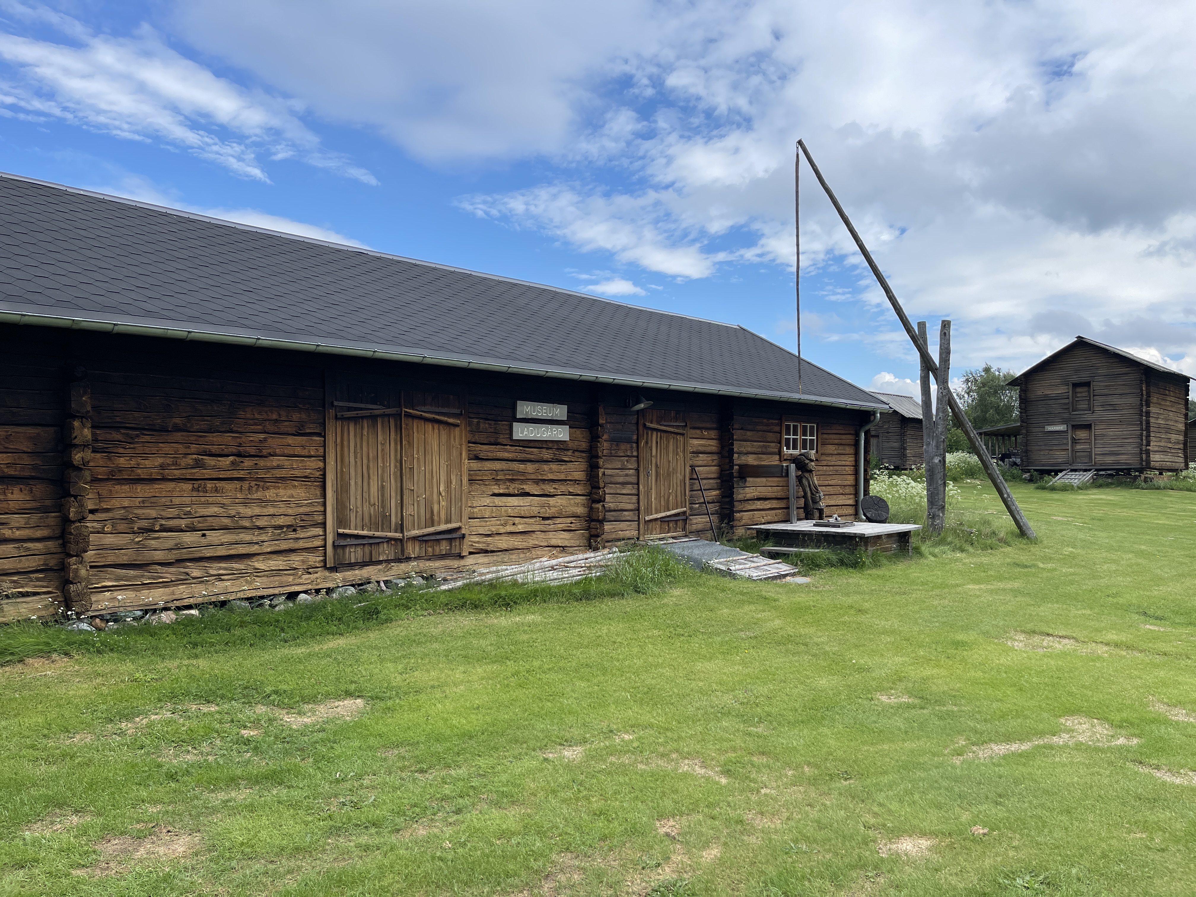 Vanaf het IJshotel ongeveer een km lopen naar een Sami museum en oud kerkje. We overnachten op een CP maar Mieke staat bij de vrachtwagens en ik op de zeer krappe camperplaats. En natuurlijk weer een hoosbui. Niet nadat Mieke me heeft geholpen met water halen. Zodat ik lekker kan douchen in mijn camper.
