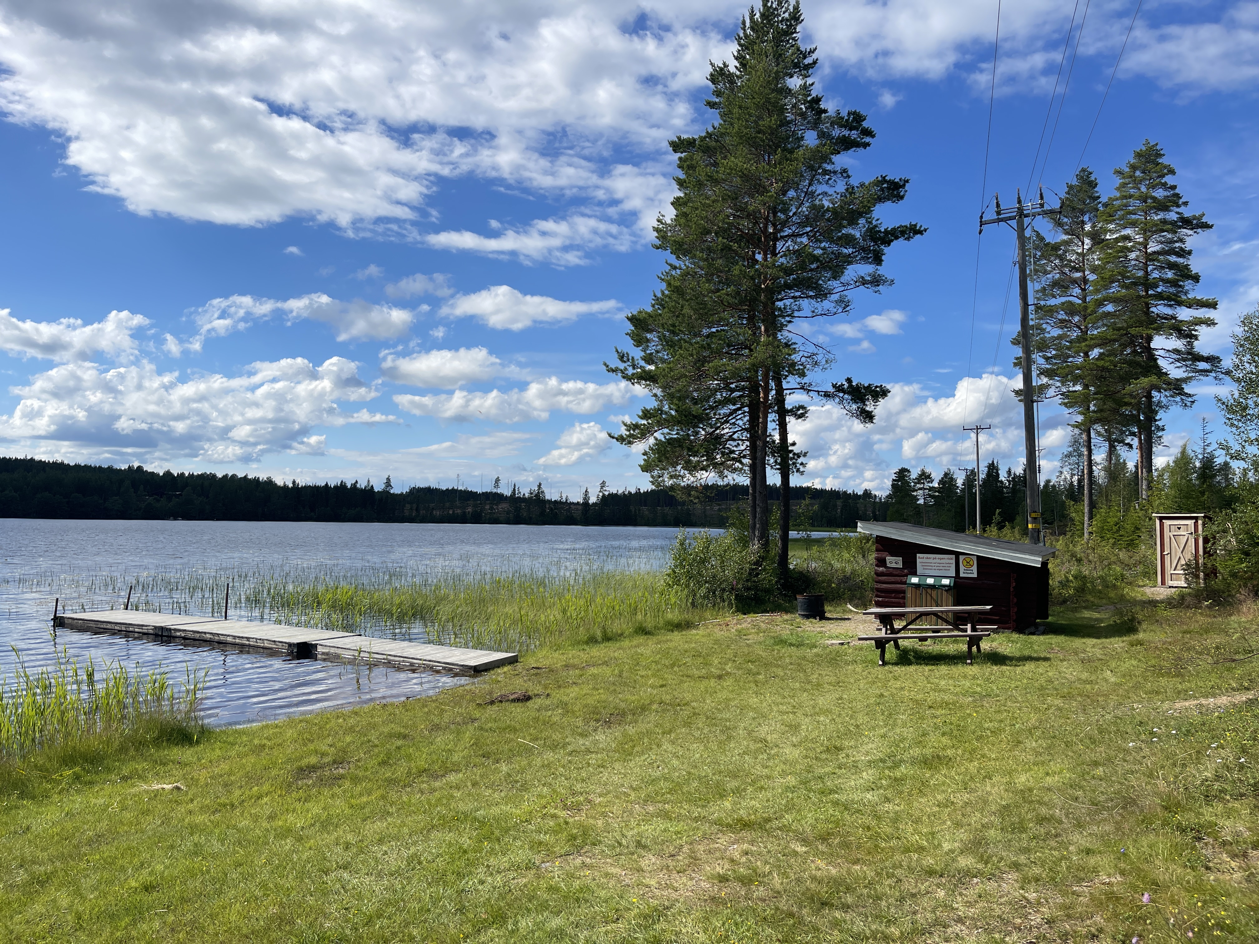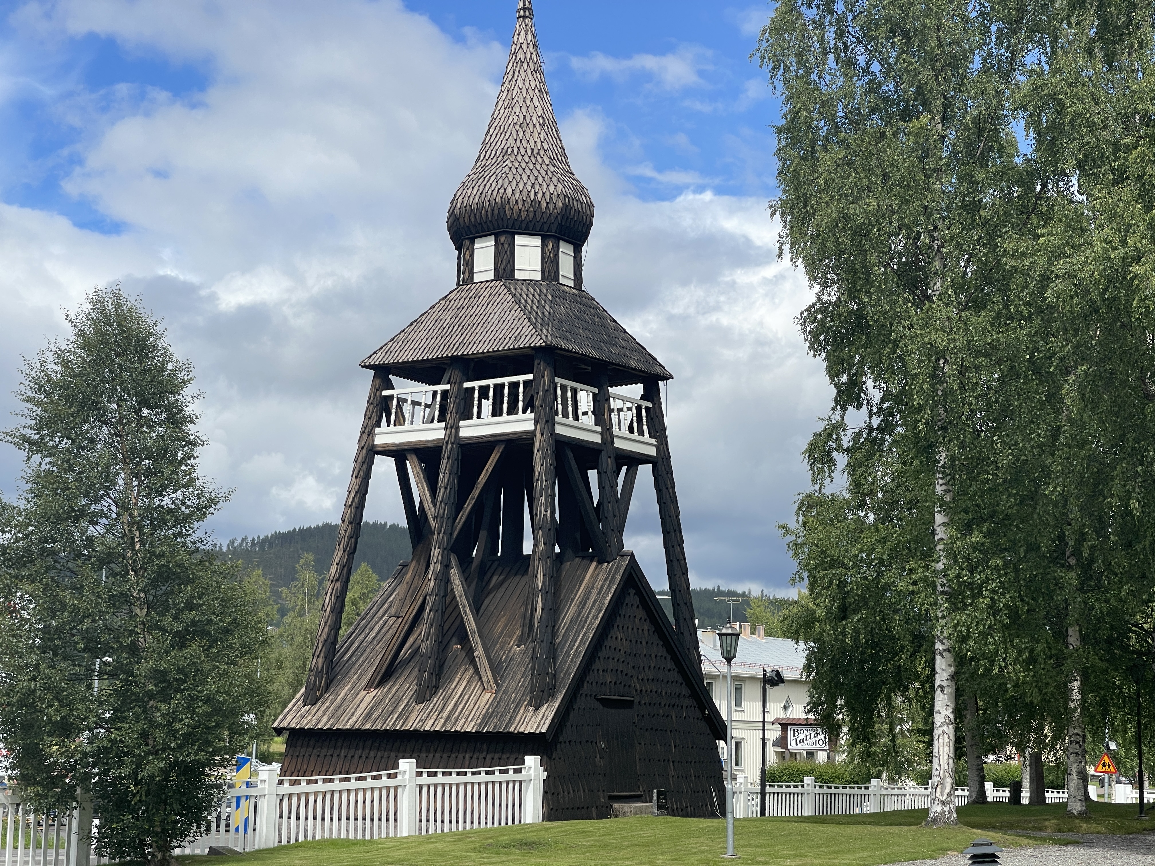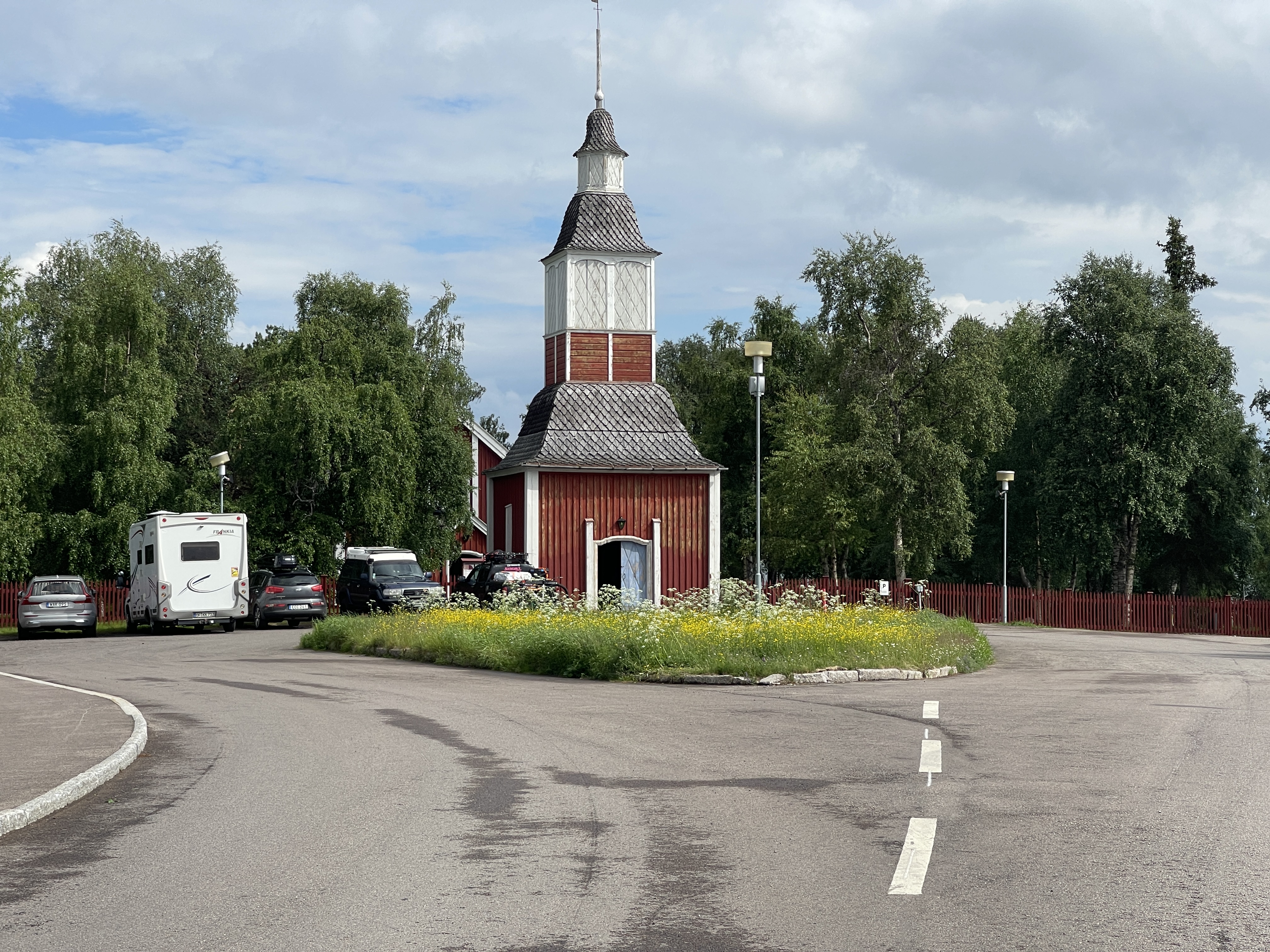 30-06 Rastplats Edefors. Gestopt in Porjus bij de waterkrachtcentrale (Vattenfall). Het oude gebouw uit 1910 staat op de monumentenlijst. Het museum was niet open. Mooie plek, goed verzorgde paden. De telefooncel op de foto, dat type, zie je vaker in Zweden. Weer verder naar Vuollerim op zoek naar het witte houten Kerkje. Dat lag erg mooi aan het water, rondom een soort gracht idee. Tegen half vier gestopt. Op een mooie plek, een parkeerplaats bij Harads.