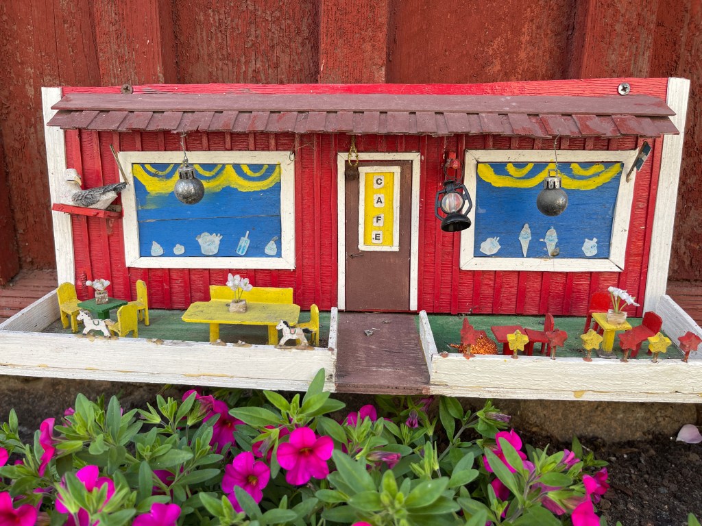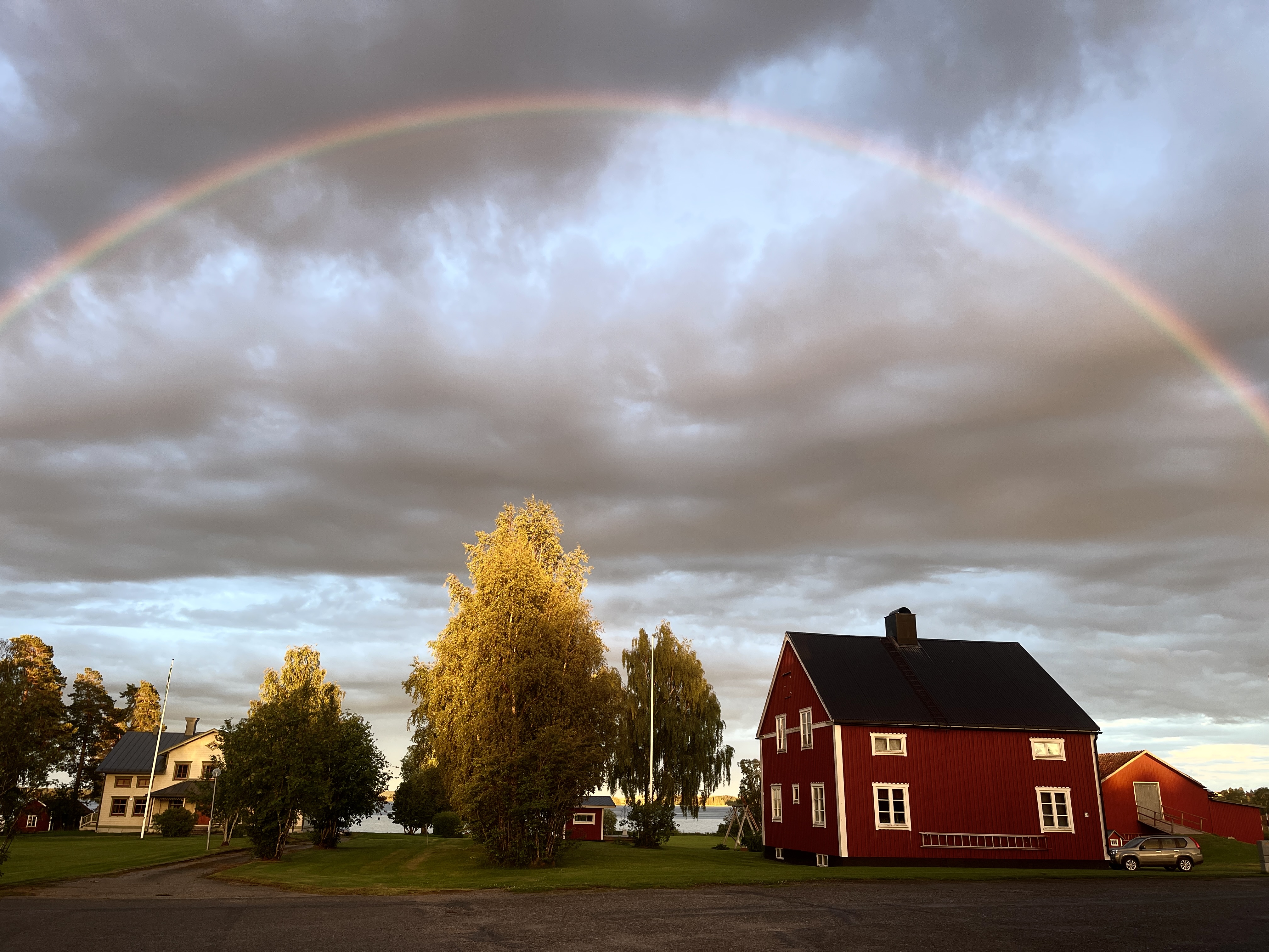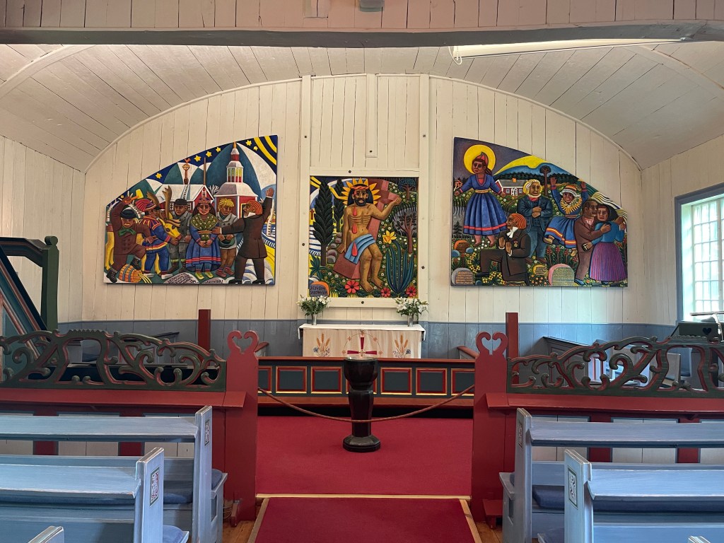 De CP die best ok is laten we dan ook links liggen. Verder naar Osterdund via een lange rechte en lelijke weg. We slaan af naar Hammerdal. Wat een prachtig dorp. We parkeren bij de kerk en voelen ons wat ongemakkelijk. Dus ga ik vragen of we hier mogen overnachten. Dat mocht en nog veel mooier: ik kreeg een uitnodiging om het concert in de kerk bij te wonen. Mieke helemaal door het dolle, Mieke maakt zelf ook muziek. Wat een ongelooflijk mooi buitenkansje. Ik was helemaal ontroerd. Cello, dwarsfluit en orgel. We hebben intens genoten. De kerk is mooi binnen, rijk versierd. En dan krijgen we ook nog een schitterende avond cadeau. De mooiste van de hele reis. Prachtig licht om een uur of tien. Nawoord. Ga ik op internet Dunderklompen opzoeken en dan blijkt de muziek van de film van Toots Tielemans te zijn’ https://nl.m.wikipedia.org/wiki/Dunderklumpen!