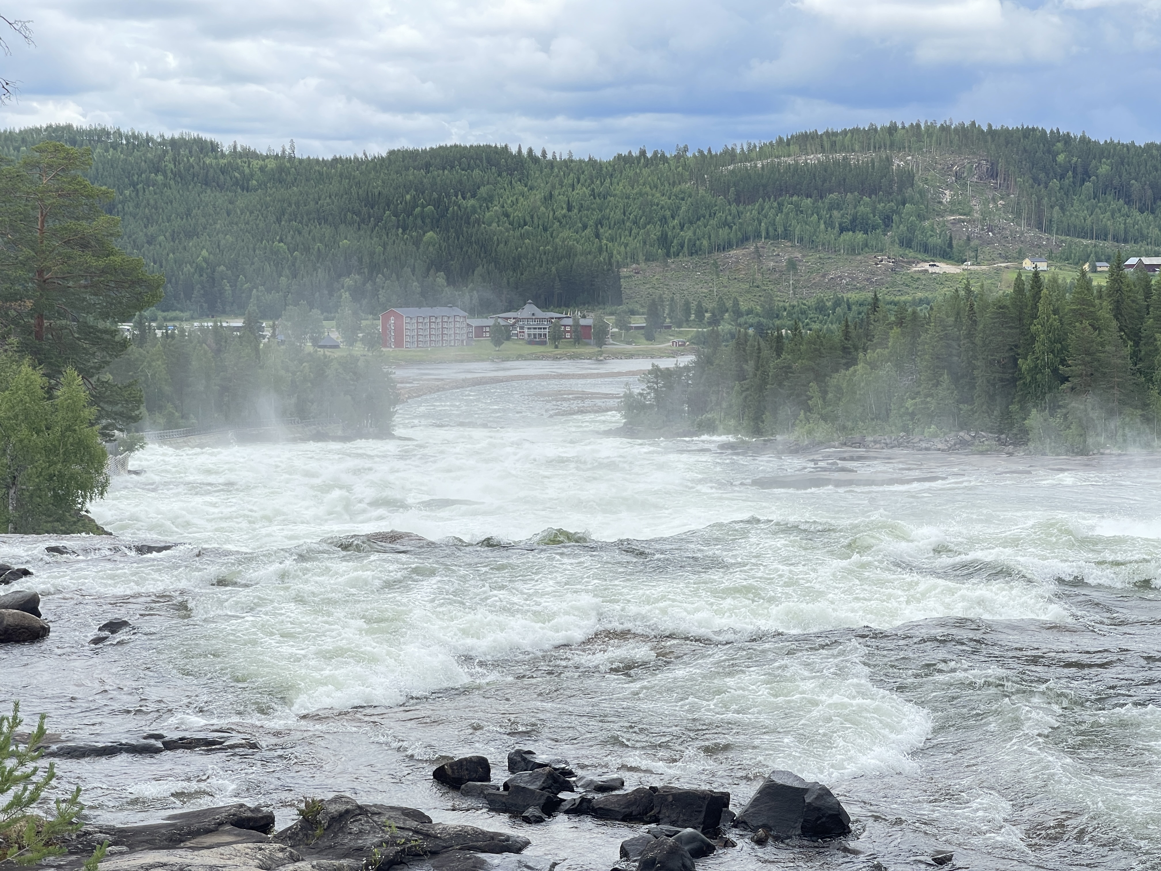 maar eenmaal op de Wilderness road al wat regendruppels. Eerste stop zou moeten zijn : Rônnäs. De naakte man die viool speelt zouden we vanaf de weg makkelijk kunnen zien vertelde de aardige jonge vrouw op de info. Maar niet dus, wij hebben hem niet gezien. De man symboliseert een Zweeds sprookje een soort Lorelei verhaal maar dan met prachtige viool muziek. Verder naar het uitzichtpunt Salonberget. Behoorlijk steil omhoog en maar hopen dat je geen tegenligger tegenkomt. Mooie lunchplek en weids uitzicht. De Trappstegsforsen bezoeken we weer met regen. Grote waterval over brede trappen.