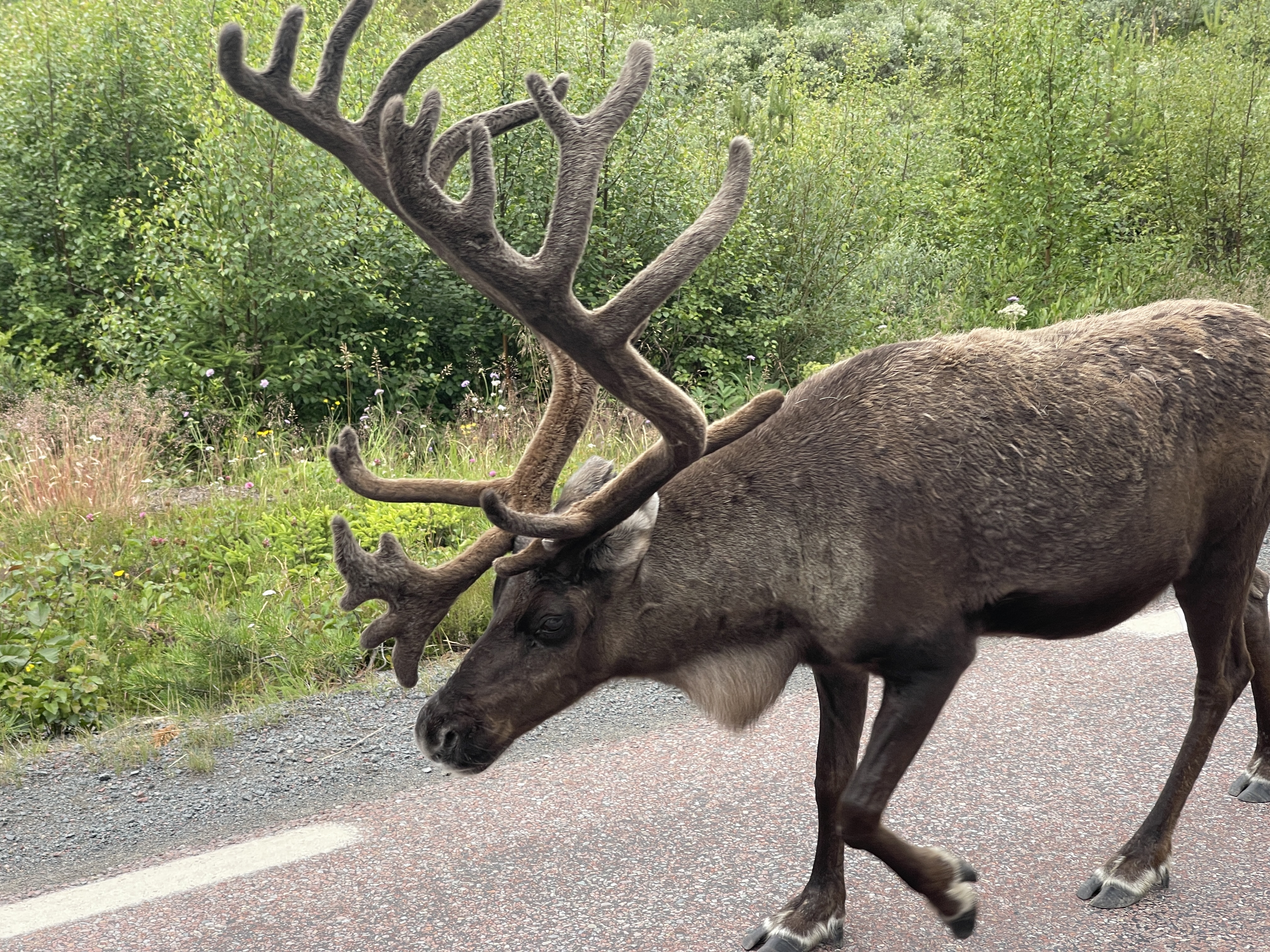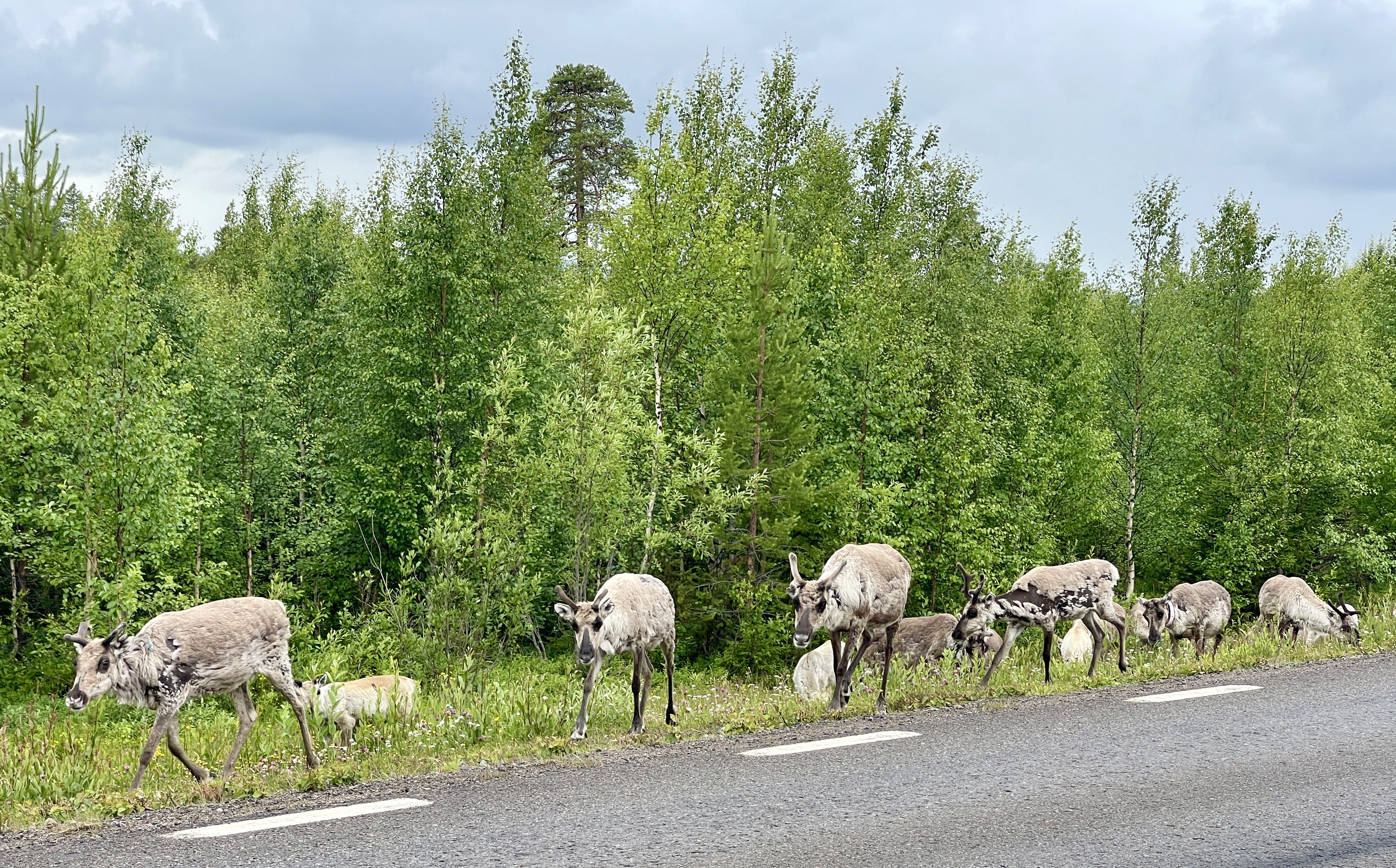 Richting Storuman op de hoogte van Lauka, het klapstuk van de dag. Ik zag een grote kudde rendieren. Mieke reed voor en zag ze niet. Zo jammer. Maar alles kwam goed want de kudde kwam om half acht langs onze overnachtingsplek. Ik zag ze vanuit mijn camperraam. Mieke gauw gebeld en zo heeft Mieke er ook van kunnen genieten. De grootste dieren hebben een kleurige halsband dus zal het een kudde zijn die ergens bij hoort. We rijden dan ook in Lapland of Samiland. De benaming “Lappen” wordt niet gewaardeerd door de Sami.