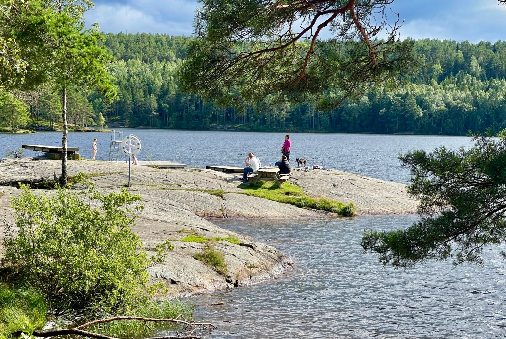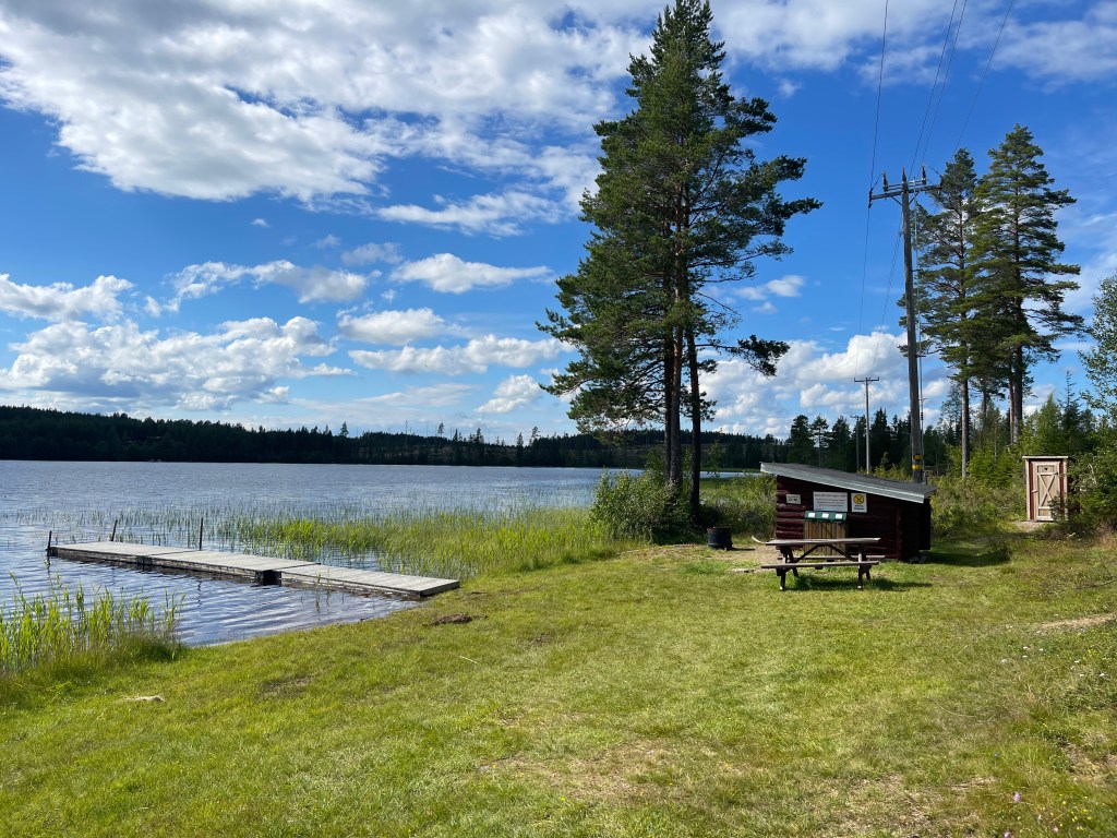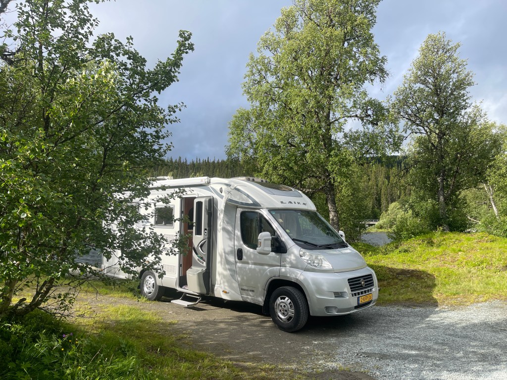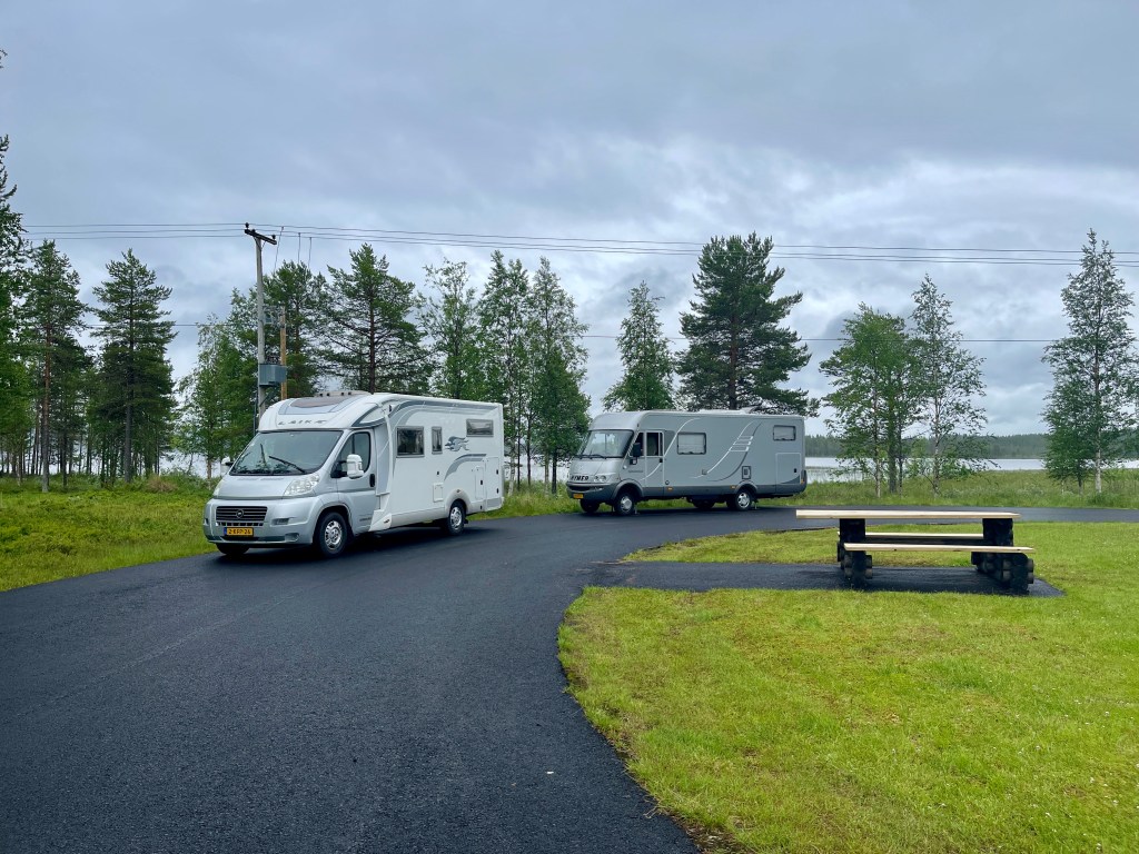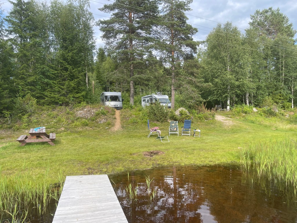 En….de wegen na Ostersund zijn een stuk drukker. We hebben het fijne Noorden nu achter ons gelaten. We overnachten op een door Mieke gevonden plek. Ze stapt dan uit en zegt: Dit vind ik een fijne plek!. Ga dan maar eens ergens anders heen willen. Mieke houdt van “gesloten” plekken en ik meer van de open plekken (kan ik sneller weg als het moet). Een smalle uitrit houd ik niet zo van.