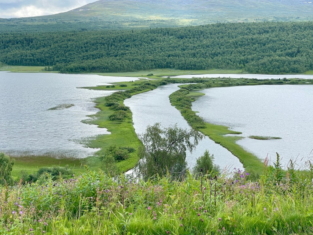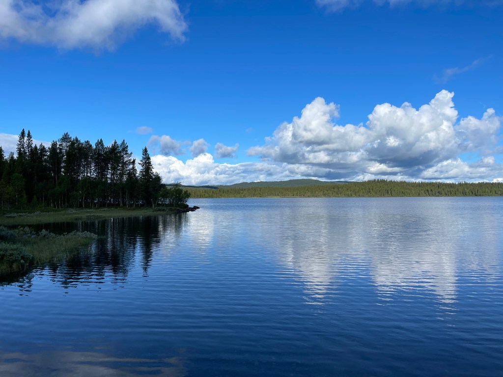 04-07 Wat hadden we toch een prachtig plekje vannacht. Ik had graag aan de picknicktafel willen ontbijten maar het was zooooo koud. Geen internet op die plek dus aanvankelijk stond er boven dit verslag op polarsteps “somewhere in the world”. We vervolgen de “Wilderness” route. Bij Klimpfjäll zie je kleine en grote landtongen in het meer. Prachtig gezicht.