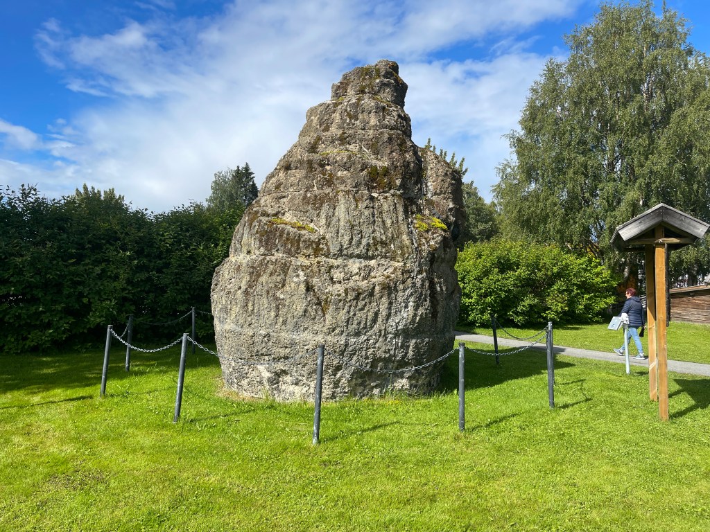 07-07 Vanmorgen weer wakker met hevige regen. We zijn in Zweden en dan ook nog in een gebied waar het veel regent. Het hoort er gewoon bij. We rijden naar Frösöm waar een Runesteen uit 1050 te bewonderen valt. Niet te vinden, dan maar eerst boodschappen doen. En opeens was het weer droog en zoeken we toch weer de Runesteen, blijkt op 400 meter afstand te staan.