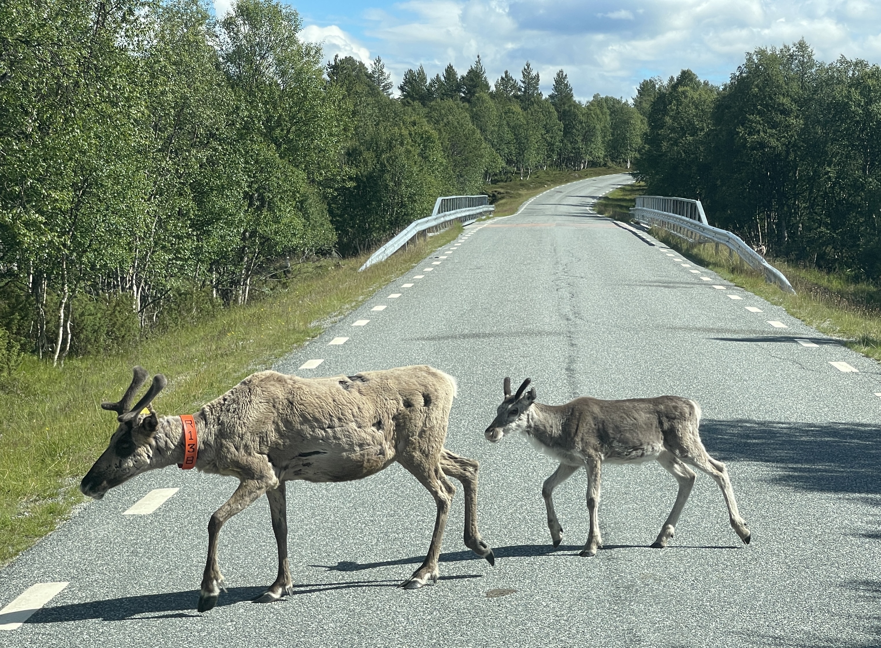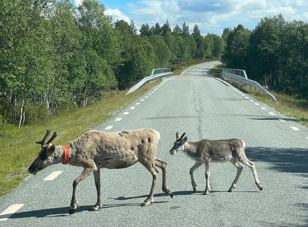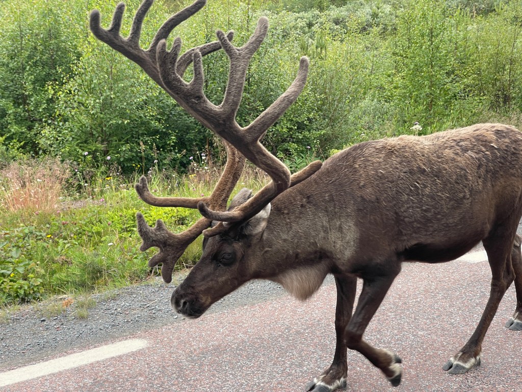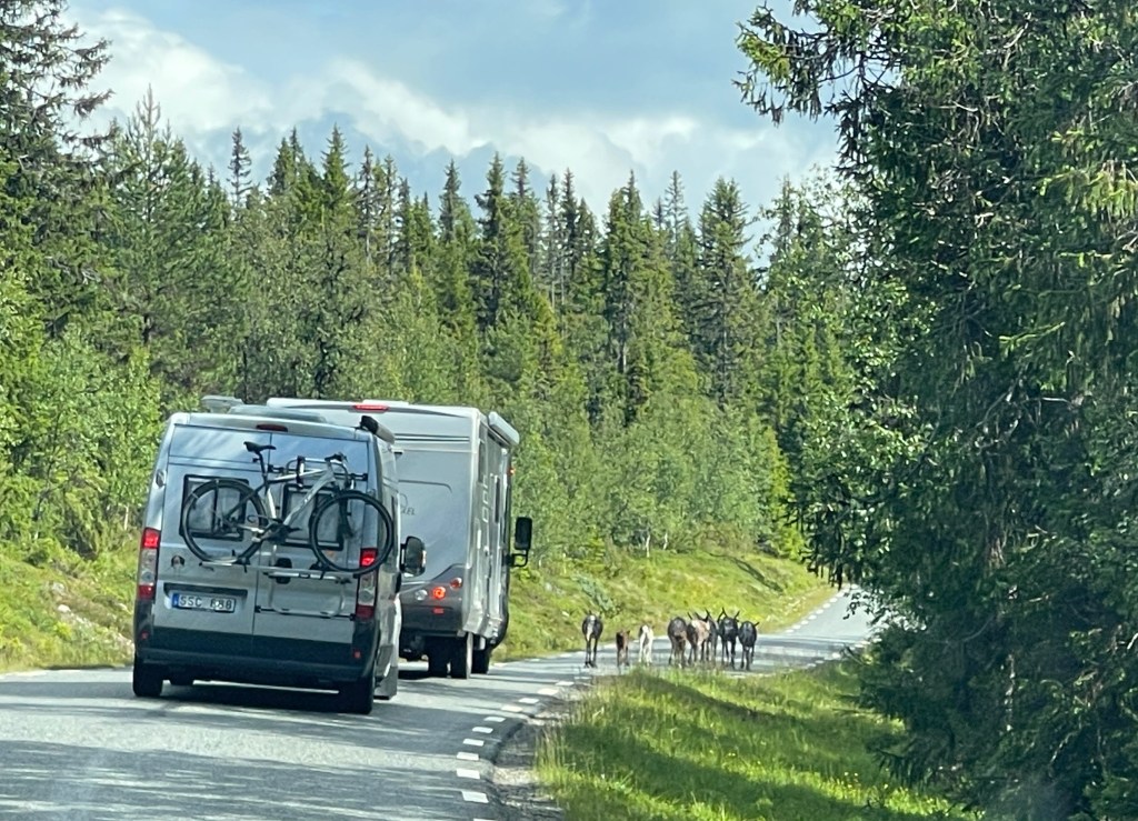 Dan een lange weg naar Tännas die je saai zou kunnen noemen. Vervolgens de 311. Wat een plezier. Zoveel rendieren!!! met kalfjes. Ook een witte waarvan de Sammi vinden dat die geluk en voorspoed brengt. Dat neem ik van harte aan.