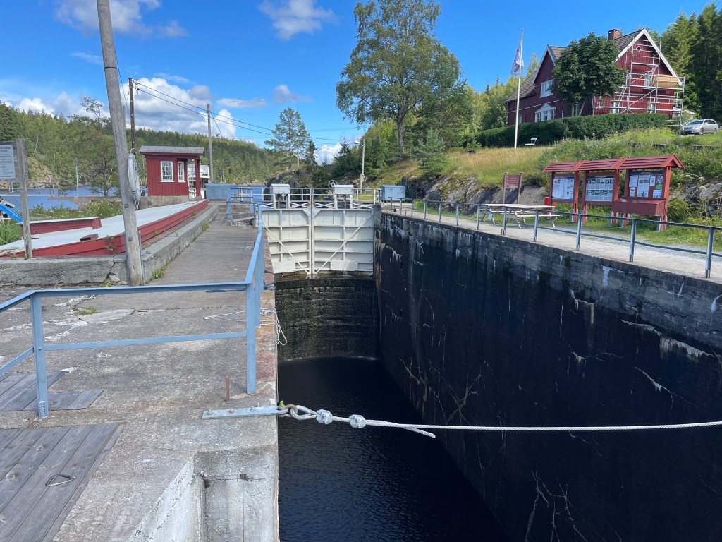 14-07 Het contrast kon ook niet groter. Gisteravond om elf uur nog zon en 20 graden en vanmorgen hevige regen. We wilden naar de westkust dus in Google maps Stromstadt ingevuld en gewoon gaan rijden. Het werd een verrassende gevarieerde route. Vooral weg 21. Het eigenlijke doel was het kleine plaatsje Berg vlak bij Halden. Daar zit een LPG station. En zo komen we weer in Noorwegen. We stoppen bij een kerk die uit baksteen is opgetrokken. Best opvallend tussen al die houten gebouwen. Even verder zien we een bord naar de Brekke sluizen. Altijd leuk om even te kijken. Ze worden sporadisch nog gebruikt. Vier sluizen overbruggen 26,6 meter. Terug op de doorgaande weg ligt een mooie rastplats aan het water. Prima overnachtingsplek en je kan er even wandelen. Picknick tafels langs het meer en mooie natuur. De LPG fles vullen moet maar even tot morgen wachten.