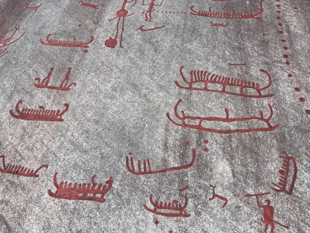 16-07 Dag van contrasten vandaag. Eerst wakker worden op een grote camperplaats en dat zijn we niet gewend. Daarna naar de rots tekeningen van Tanum. Eerst naar bezoekerscentrum in Vitlycke. De rotstekeningen liggen aan de andere kant van de weg. Met een gids of zelf rondlopen, beide kan.