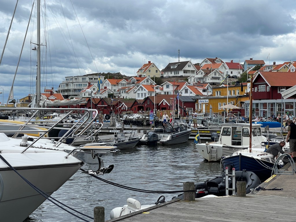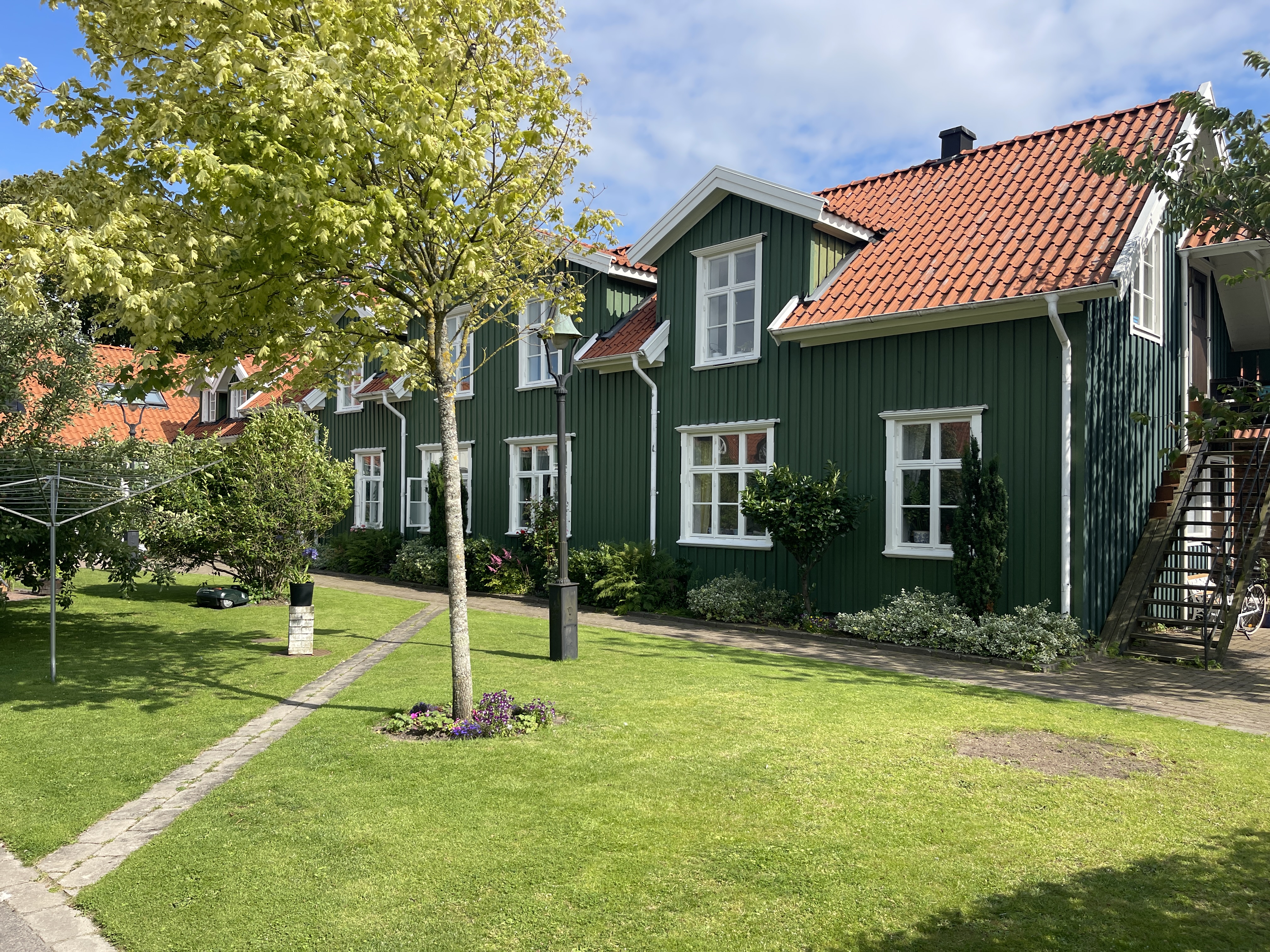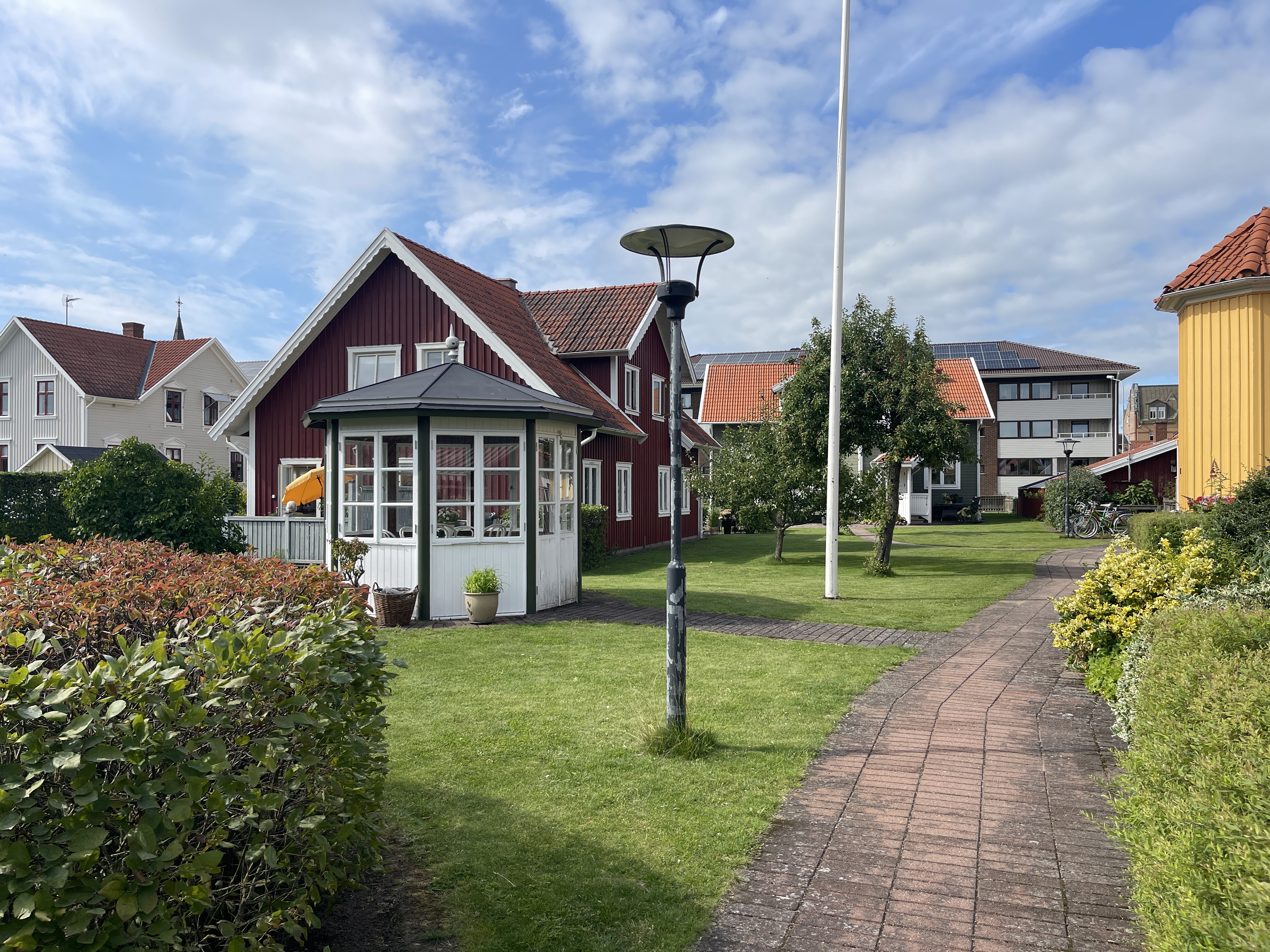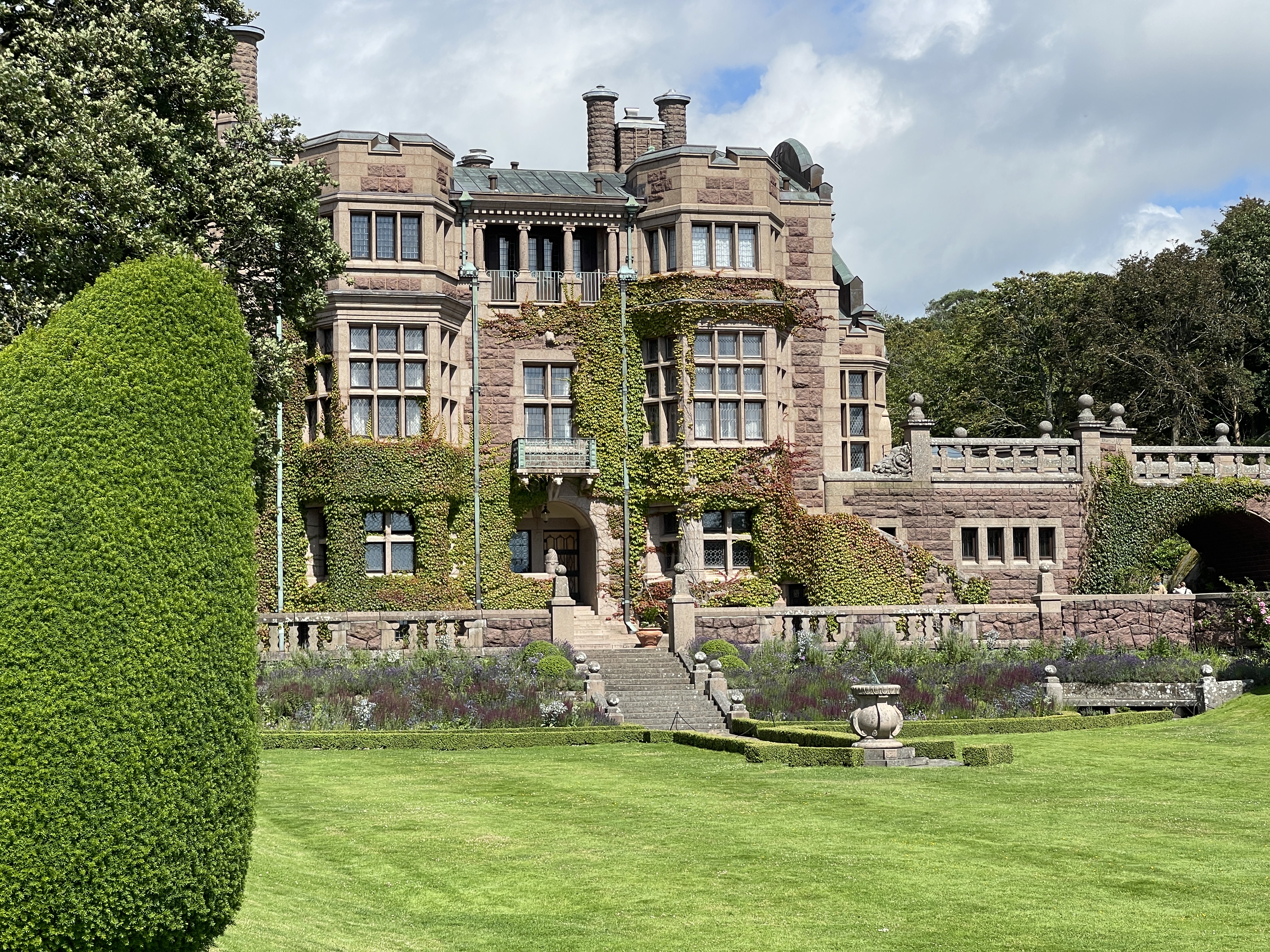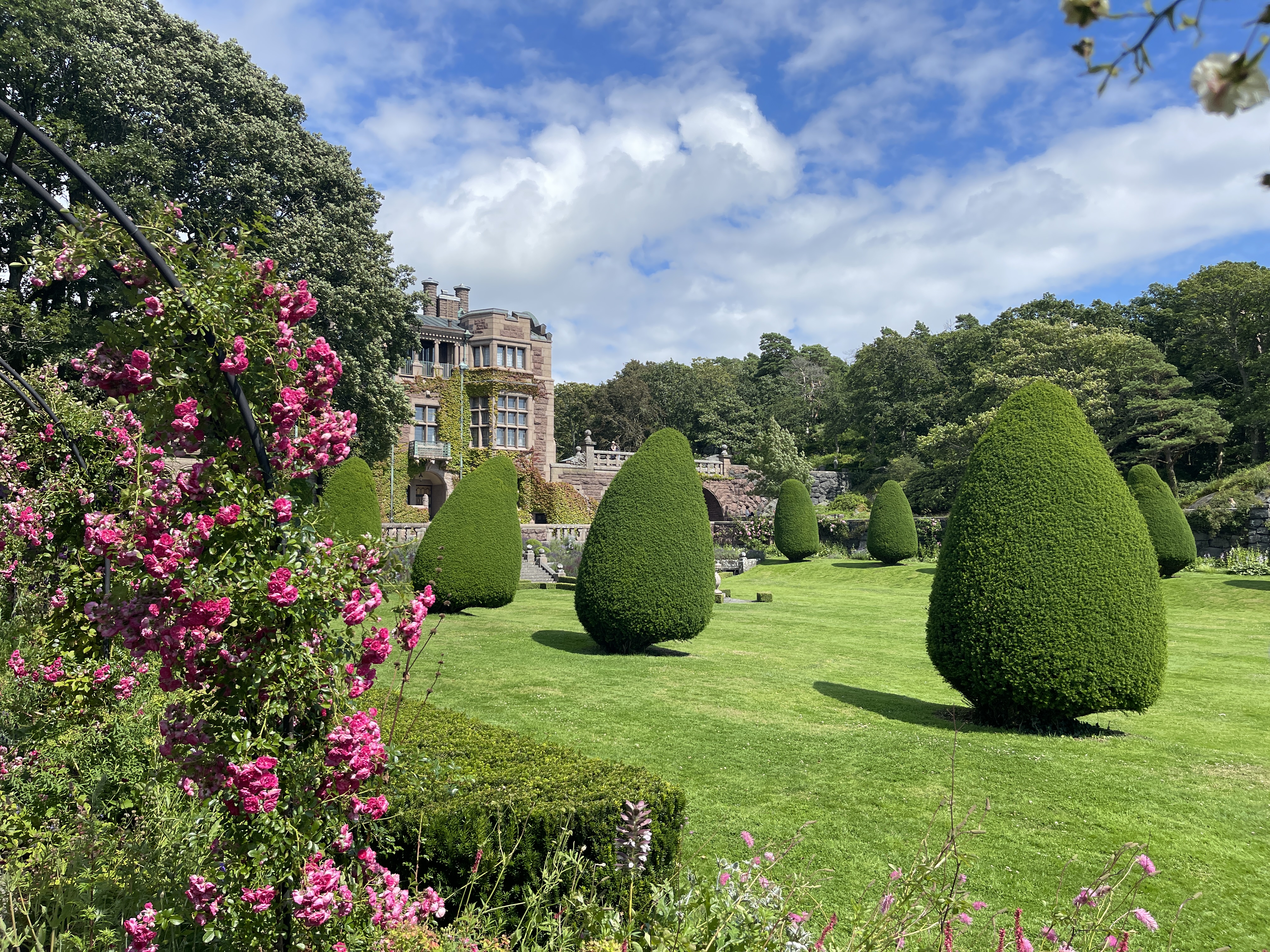 17-07 Het besluit was gisteravond al genomen toen we nog even buiten zaten en het weer begon te regenen. Onder Göteborg beloofde de weerapp beter weer. 175 km gereden tot Åse. We staan aan zee, droog en af en toen zon. Meteen de fietsen gepakt naar het Tjolöholm Slot. En toen we er vlak bij waren realiseerde ik me dat ik daar vorig jaar ook ben geweest. Een prachtig slot maar ook de ligging is schitterend. De tuinen en het laantje met bogen met bloemen. Je kan er uren doorbrengen. Vergeet ook vooral het dorpje niet, De eigenaresse heeft dat laten bouwen voor haar werknemers. Je kan er ook zwemmen, de mooie tuin komt tot het water. Vorig jaar heb ik daar overnacht en heb daar veel kunnen rondlopen. Nu vond ik fijn om terug te kunnen fietsen voor het plekje aan zee.