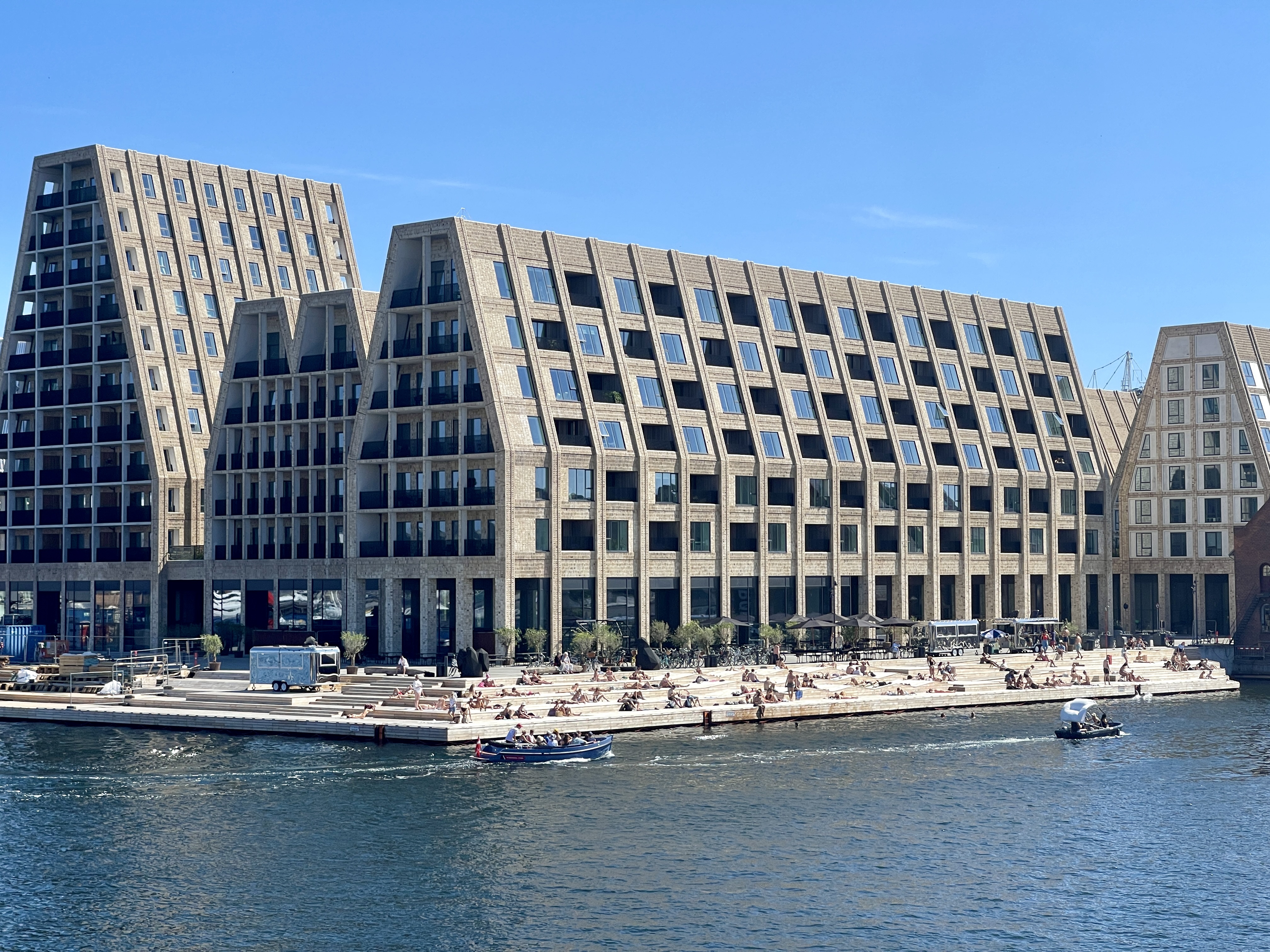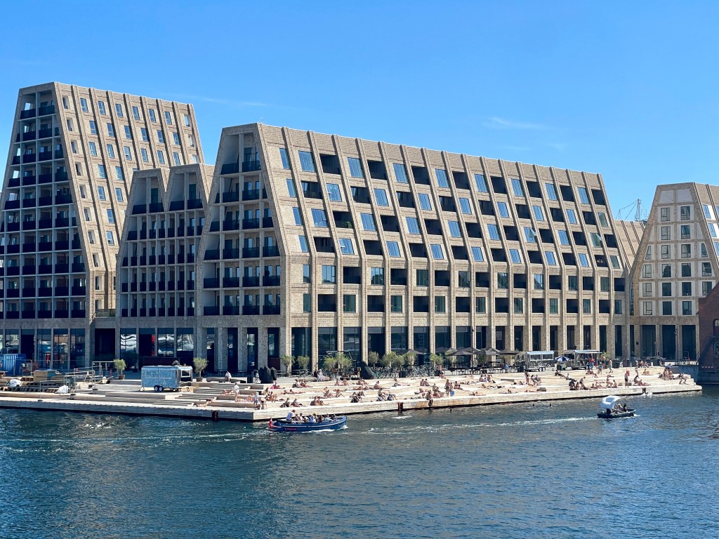 Bij het slot was het al vroeg druk. We zijn niet naar binnen gegaan en hebben rond het slot gelopen. Fietsen in deze stad is heel makkelijk, brede fietspaden. We zien al fietsend veel van de buitenwijken en de toch strenge appartement aan weerszijde. Door naar de Christiansborgh, de zetel van het Deense parlement en ook in gebruik door de Koninklijke familie bij officiële gebeurtenissen. En dan zijn we bij de Strøget, de langste autovrije winkelstraat van Europa. En druk!! Ik mijzelf een badeendje cadeau gedaan voor op de nieuwe wastafel thuis. Twee uur weer terug bij de camper. Voet omhoog en lezen.